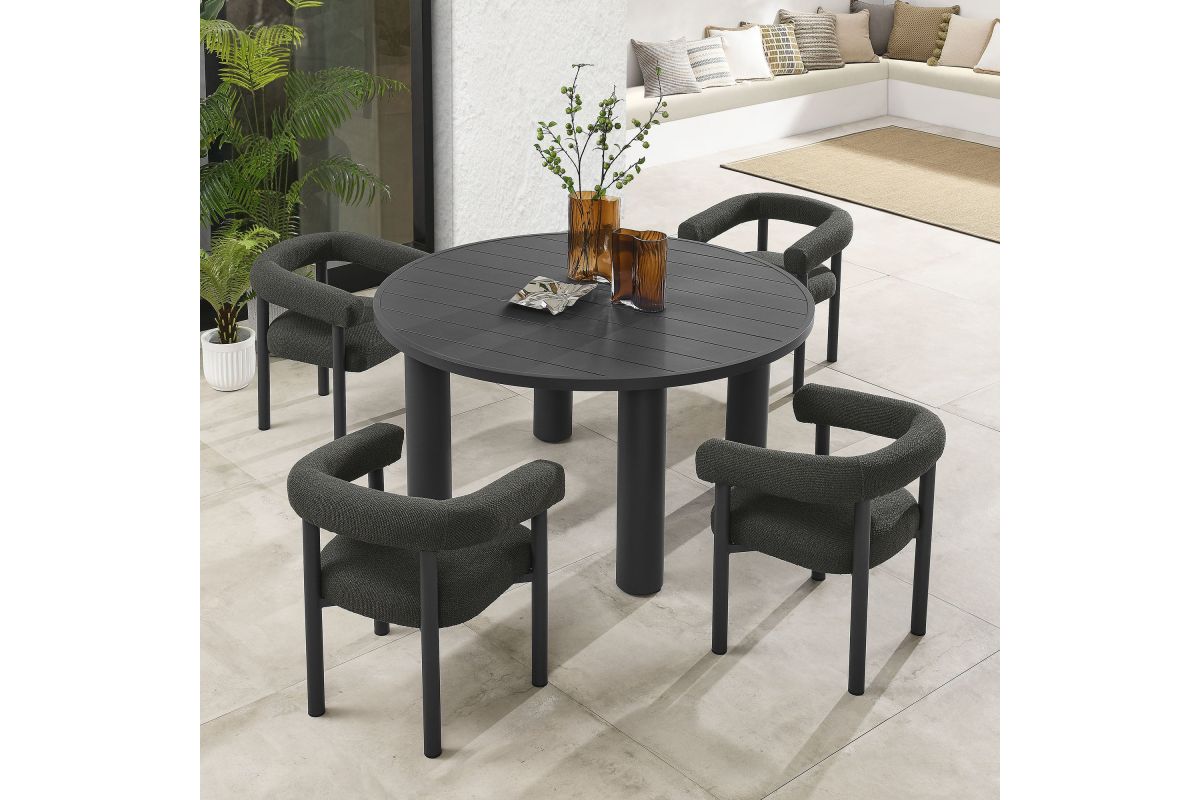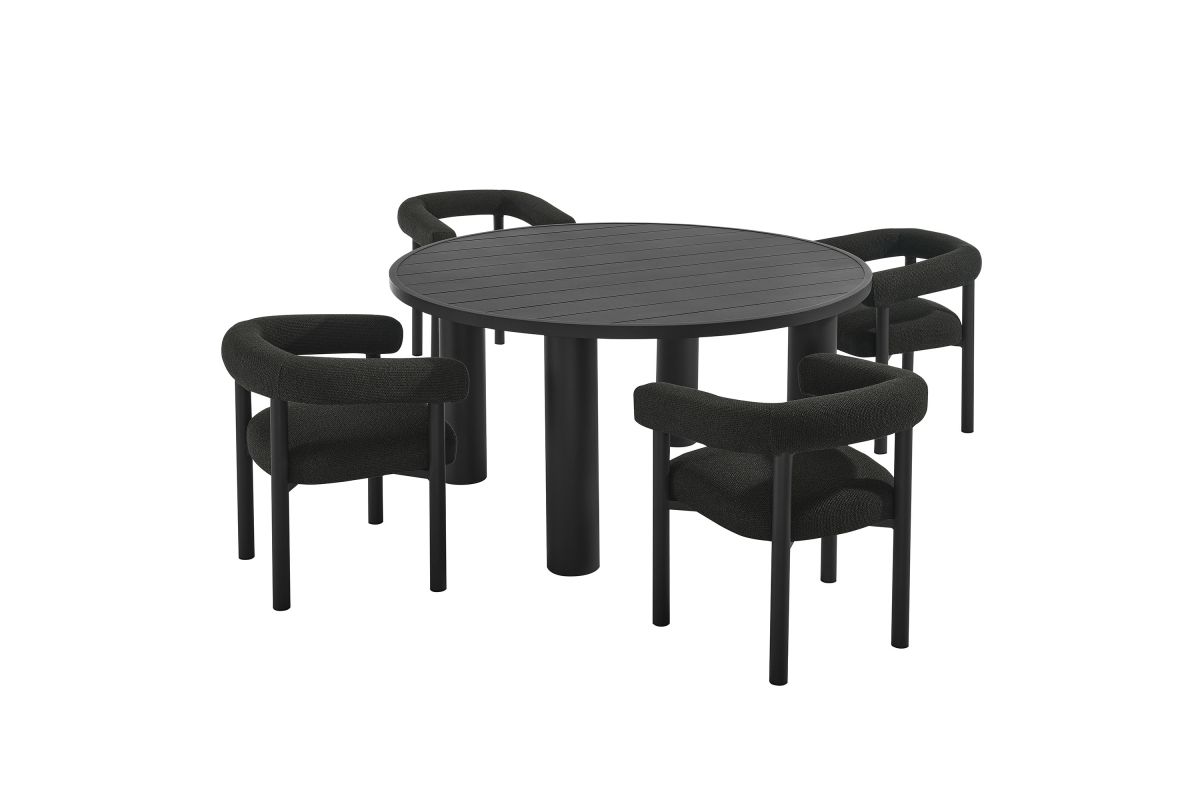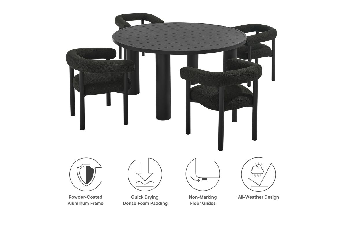Elevate your outdoor space with the Nautica Modern Contemporary 5-Piece Outdoor Dining Set. This patio furniture dining set includes a 60" round aluminum dining table and four curved-back patio armchairs, combining durability with sleek design. Crafted from powder-coated metal, the aluminum outdoor dining chairs and table offer a perfect blend of aesthetic appeal and functionality. The curved back and sleek tubular frames of the chairs provide a comfortable seating experience, while the round slatted tabletop and tubular legs of the table ensure stability and style. Designed for all weather conditions, the dining chairs feature quick-drying dense foam padding and water-resistant fabric upholstery. The non-marking plastic foot glides protect your flooring, making this aluminum outdoor dining set ideal for any surface. Designed as a versatile patio table set, the Nautica 5-Piece Aluminum Outdoor Dining Set with Curved Back Patio Armchairs is your go-to choice for exceptional outdoor dining. Enhance your backyard, porch, or garden with this aluminum patio furniture collection, and enjoy comfort and style all year round. Assembly required.