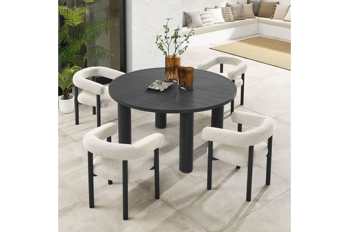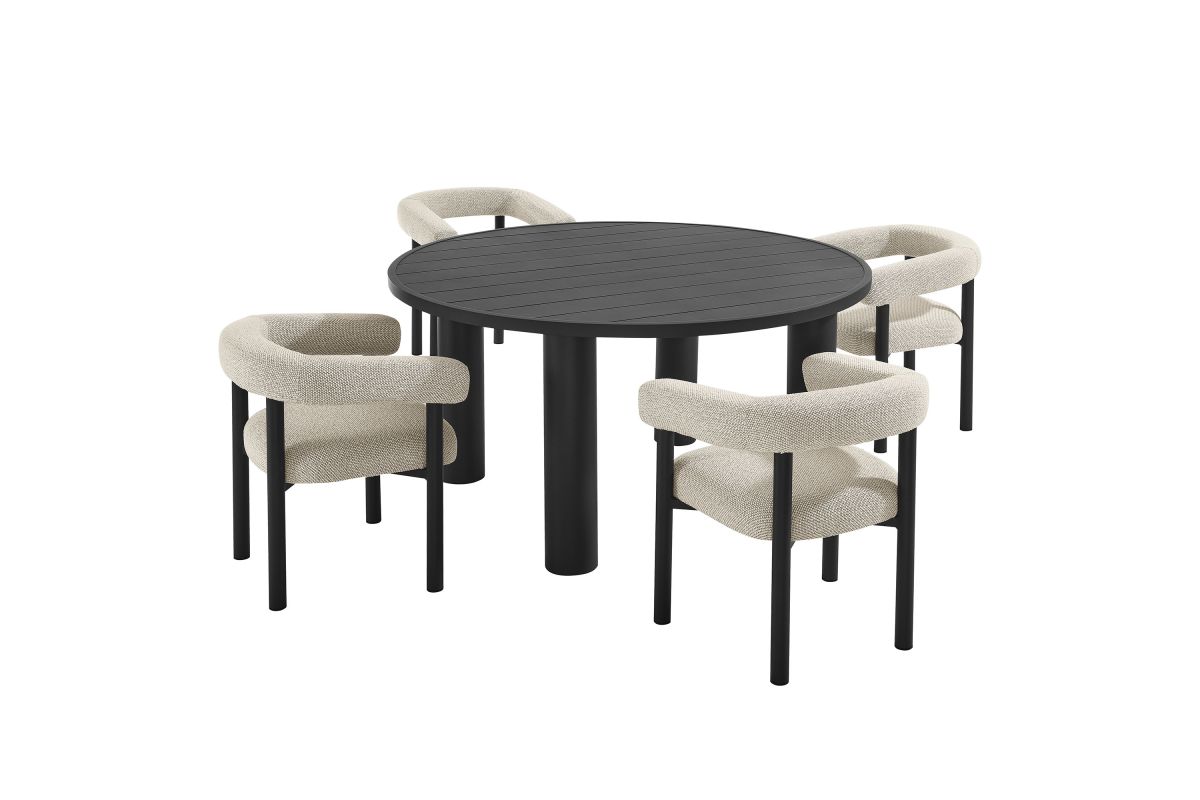 Elevate your outdoor space with the Nautica Modern Contemporary 5-Piece Outdoor Dining Set. This patio furniture dining set includes a 60" round aluminum dining table and four curved-back patio armchairs, combining durability with sleek design. Crafted from powder-coated metal, the aluminum outdoor dining chairs and table offer a perfect blend of aesthetic appeal and functionality. The curved back and sleek tubular frames of the chairs provide a comfortable seating experience, while the round slatted tabletop and tubular legs of the table ensure stability and style. Designed for all weather conditions, the dining chairs feature quick-drying dense foam padding and water-resistant fabric upholstery. The non-marking plastic foot glides protect your flooring, making this aluminum outdoor dining set ideal for any surface. Designed as a versatile patio table set, the Nautica 5-Piece Aluminum Outdoor Dining Set with Curved Back Patio Armchairs is your go-to choice for exceptional outdoor dining. Enhance your backyard, porch, or garden with this aluminum patio furniture collection, and enjoy comfort and style all year round. Assembly required.