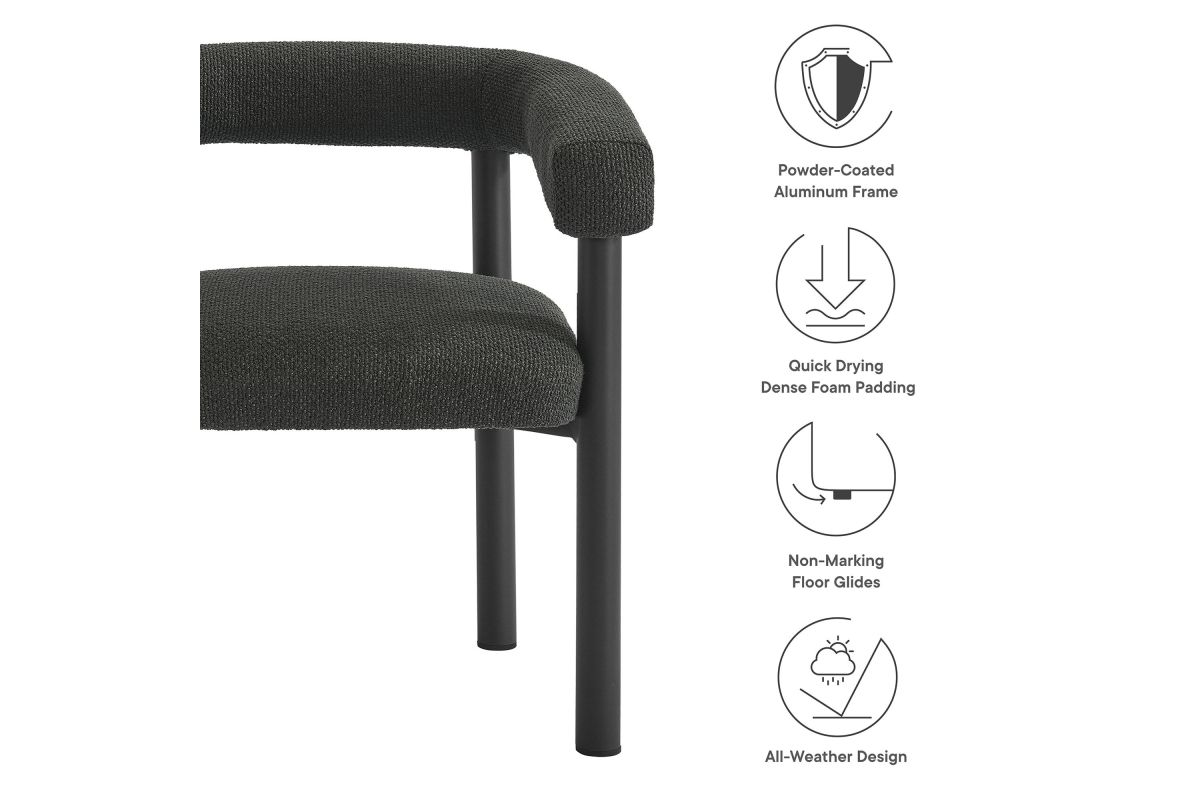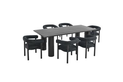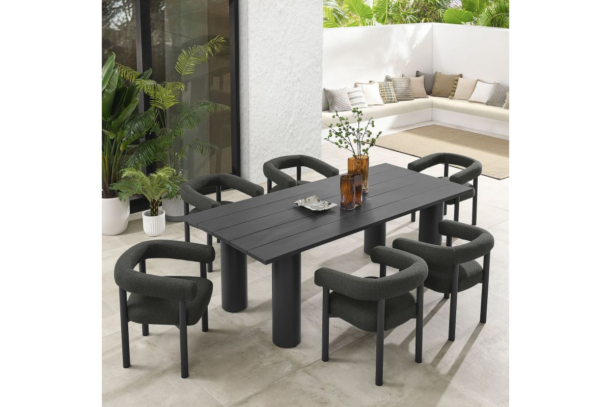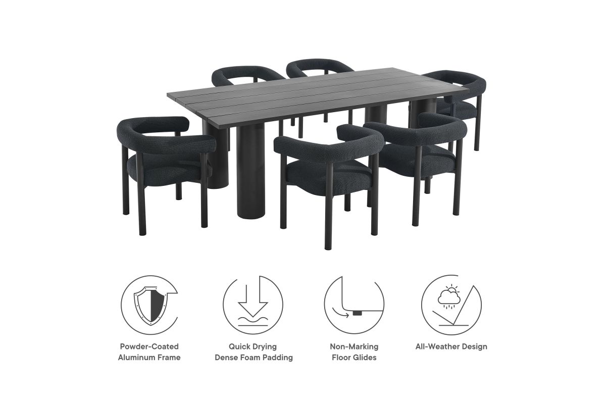 Elevate your outdoor space with the Nautica Modern Contemporary 7-Piece Outdoor Dining Set. This patio furniture dining set includes an 87" rectangular aluminum dining table and six curved-back patio armchairs, combining durability with sleek design. Crafted from powder-coated metal, the aluminum outdoor dining chairs and table offer a perfect blend of aesthetic appeal and functionality. The curved back and sleek tubular frames of the chairs provide a comfortable seating experience, while the slatted tabletop and tubular legs of the table ensure stability and style. Designed for all weather conditions, the dining chairs feature quick-drying dense foam padding and water-resistant fabric upholstery. The non-marking plastic foot glides protect your flooring, making this aluminum outdoor dining set ideal for any surface. Designed as a versatile patio table set, the Nautica 7-Piece Aluminum Outdoor Dining Set with Round Back Patio Armchairs is your go-to choice for exceptional outdoor dining. Enhance your backyard, porch, or garden with this aluminum patio furniture collection, and enjoy comfort and style all year round. Assembly required.