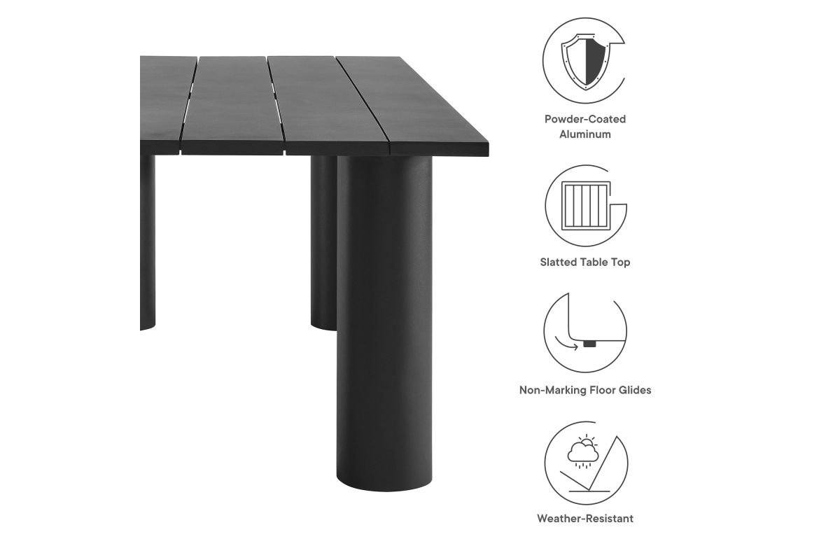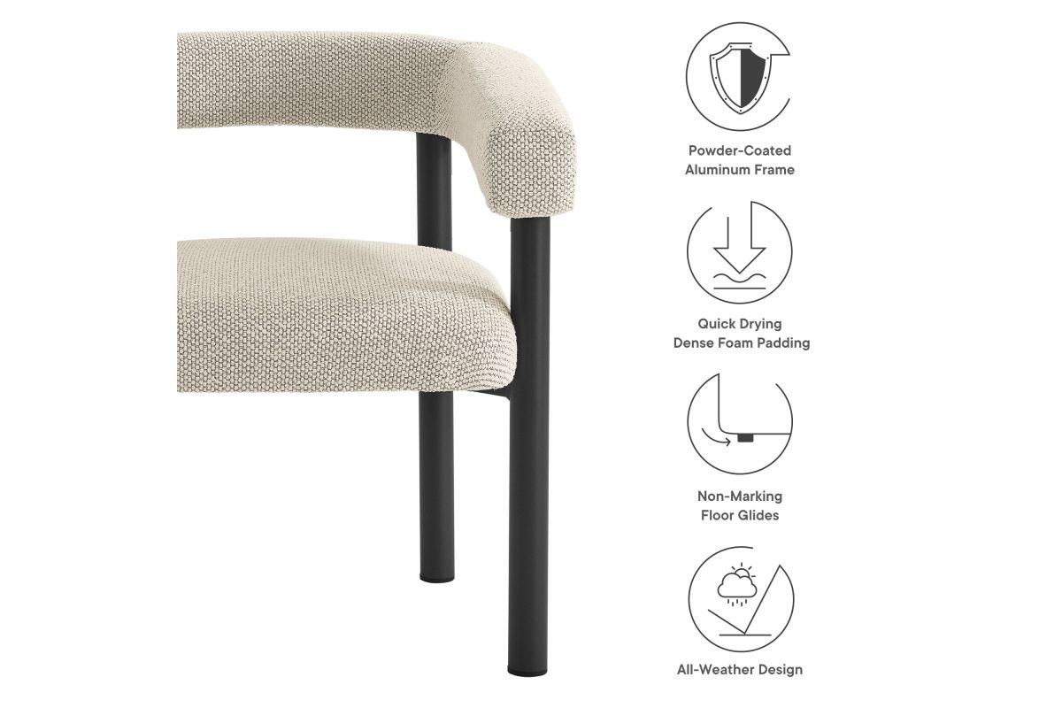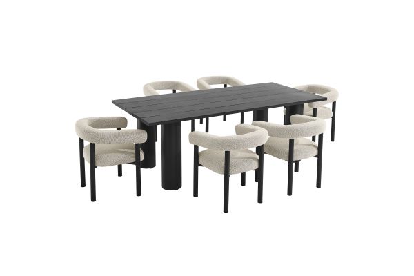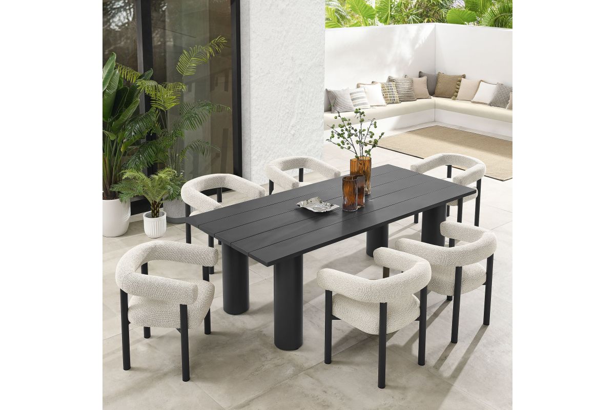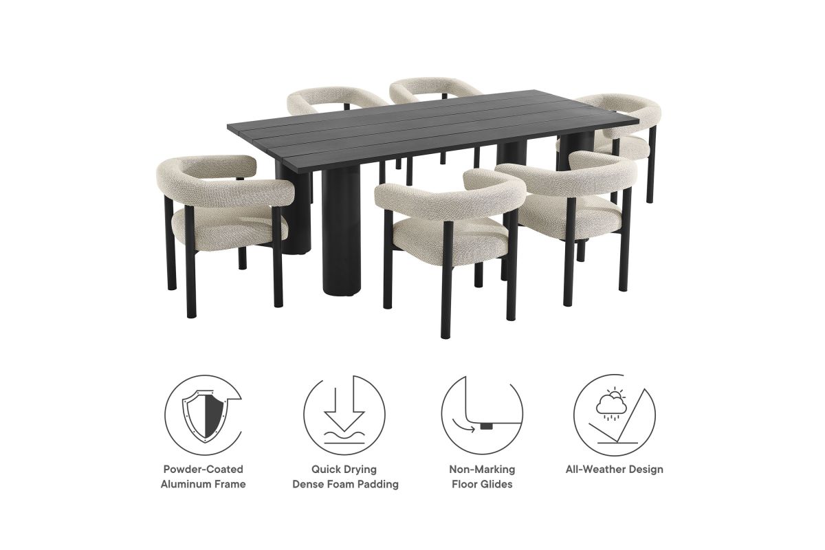Elevate your outdoor space with the Nautica Modern Contemporary 7-Piece Outdoor Dining Set. This patio furniture dining set includes an 87" rectangular aluminum dining table and six curved-back patio armchairs, combining durability with sleek design. Crafted from powder-coated metal, the aluminum outdoor dining chairs and table offer a perfect blend of aesthetic appeal and functionality. The curved back and sleek tubular frames of the chairs provide a comfortable seating experience, while the slatted tabletop and tubular legs of the table ensure stability and style. Designed for all weather conditions, the dining chairs feature quick-drying dense foam padding and water-resistant fabric upholstery. The non-marking plastic foot glides protect your flooring, making this aluminum outdoor dining set ideal for any surface. Designed as a versatile patio table set, the Nautica 7-Piece Aluminum Outdoor Dining Set with Round Back Patio Armchairs is your go-to choice for exceptional outdoor dining. Enhance your backyard, porch, or garden with this aluminum patio furniture collection, and enjoy comfort and style all year round. Assembly required.