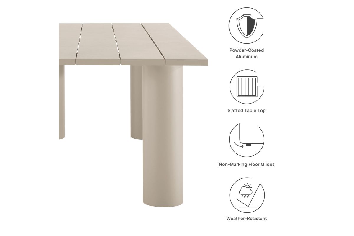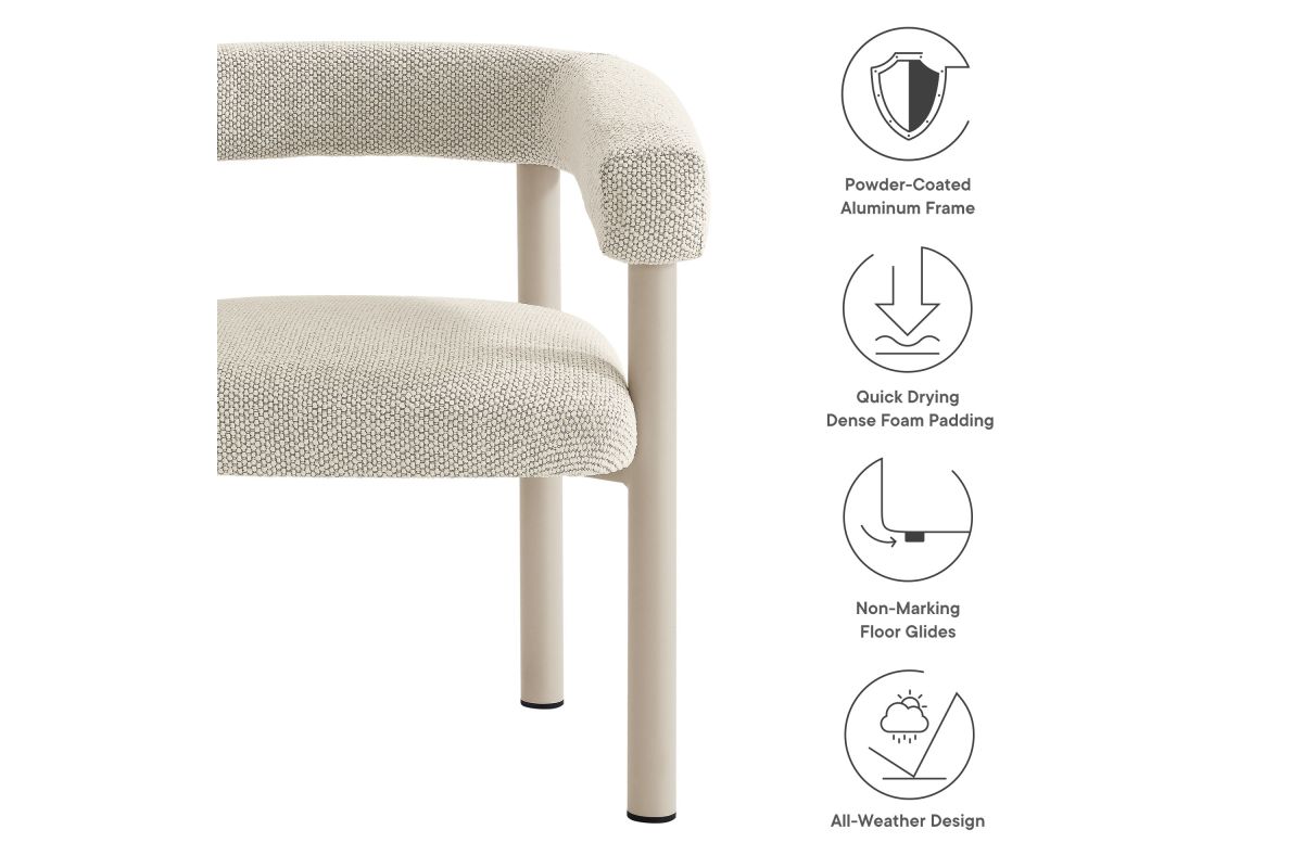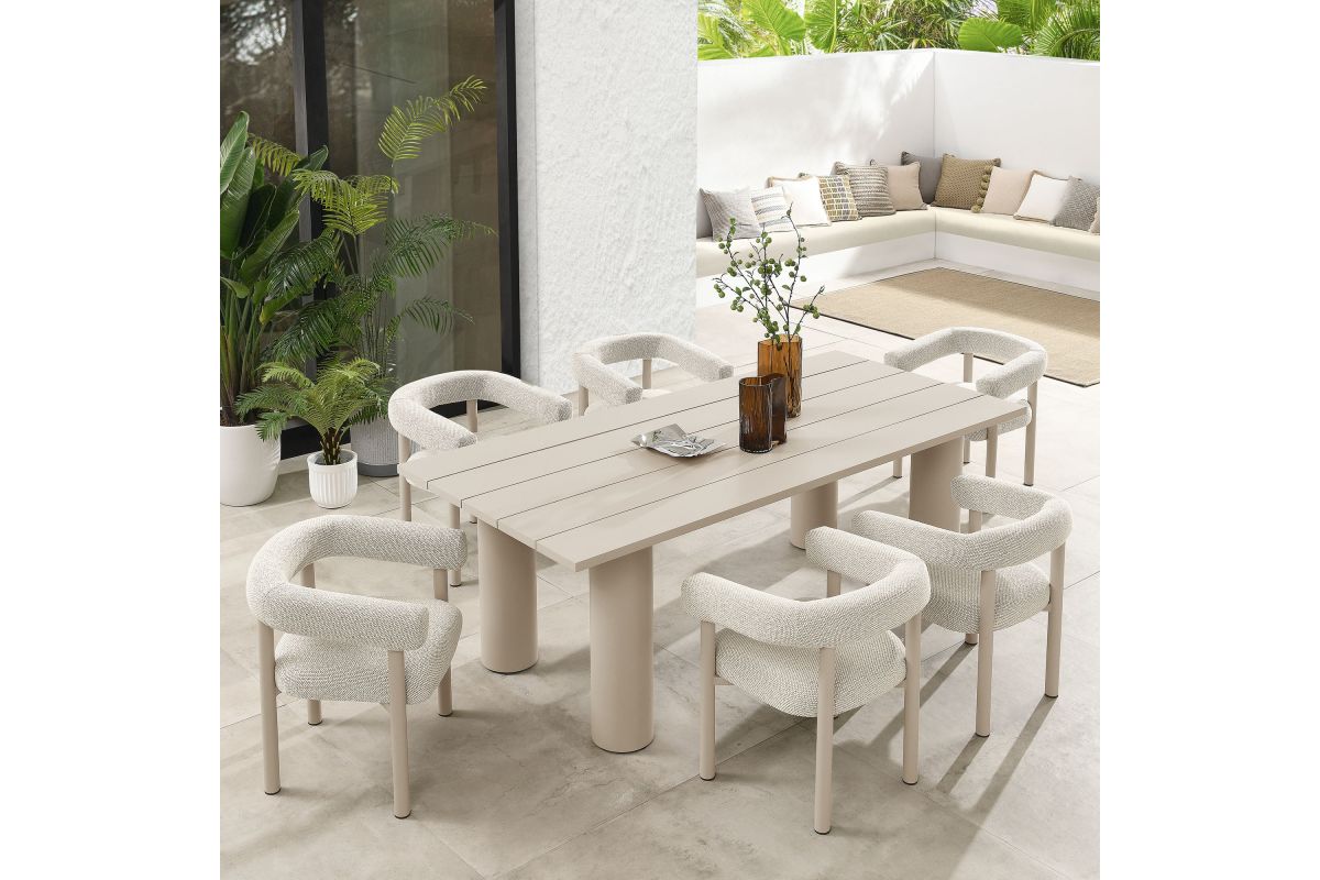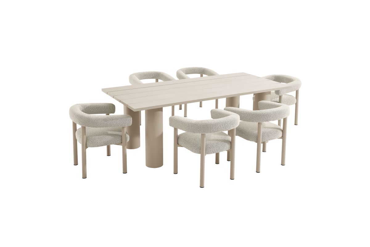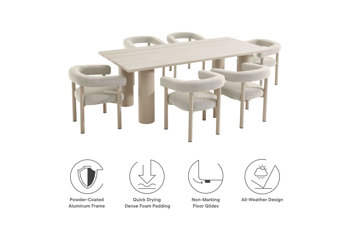 Elevate your outdoor space with the Nautica Modern Contemporary 7-Piece Outdoor Dining Set. This patio furniture dining set includes an 87" rectangular aluminum dining table and six curved-back patio armchairs, combining durability with sleek design. Crafted from powder-coated metal, the aluminum outdoor dining chairs and table offer a perfect blend of aesthetic appeal and functionality. The curved back and sleek tubular frames of the chairs provide a comfortable seating experience, while the slatted tabletop and tubular legs of the table ensure stability and style. Designed for all weather conditions, the dining chairs feature quick-drying dense foam padding and water-resistant fabric upholstery. The non-marking plastic foot glides protect your flooring, making this aluminum outdoor dining set ideal for any surface. Designed as a versatile patio table set, the Nautica 7-Piece Aluminum Outdoor Dining Set with Round Back Patio Armchairs is your go-to choice for exceptional outdoor dining. Enhance your backyard, porch, or garden with this aluminum patio furniture collection, and enjoy comfort and style all year round. Assembly required.