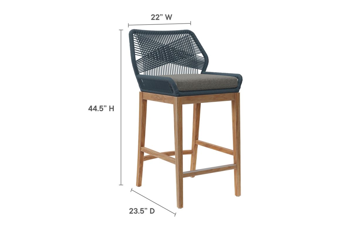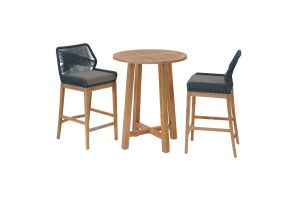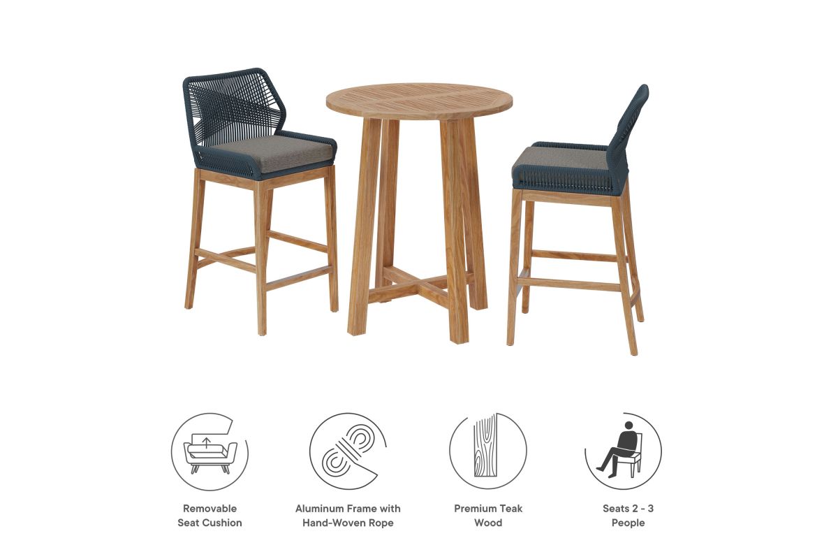 Enjoy the company of family and friends or a peaceful morning around the Wellspring 3-Piece Outdoor Bar Set. Crafted from premium, weather-resistant solid teak, this patio dining set includes a 36" round high-top bar table with a slatted surface and two matching bar-height stools. Both the tall bistro table and stools feature sturdy teak wood bases with non-marking foot caps to protect outdoor flooring, while the table's cross supports enhance stability. The modern bar stools are designed with aluminum seats, woven rope backs, and thick foam-padded cushions for lasting comfort. The cushions include ties for a secure fit and can be easily removed for cleaning. Whether placed on your porch, patio, or in the backyard, this outdoor dining set brings a warm, inviting ambiance, creating the perfect spot for two to enjoy drinks or meals al fresco. Assembly required.