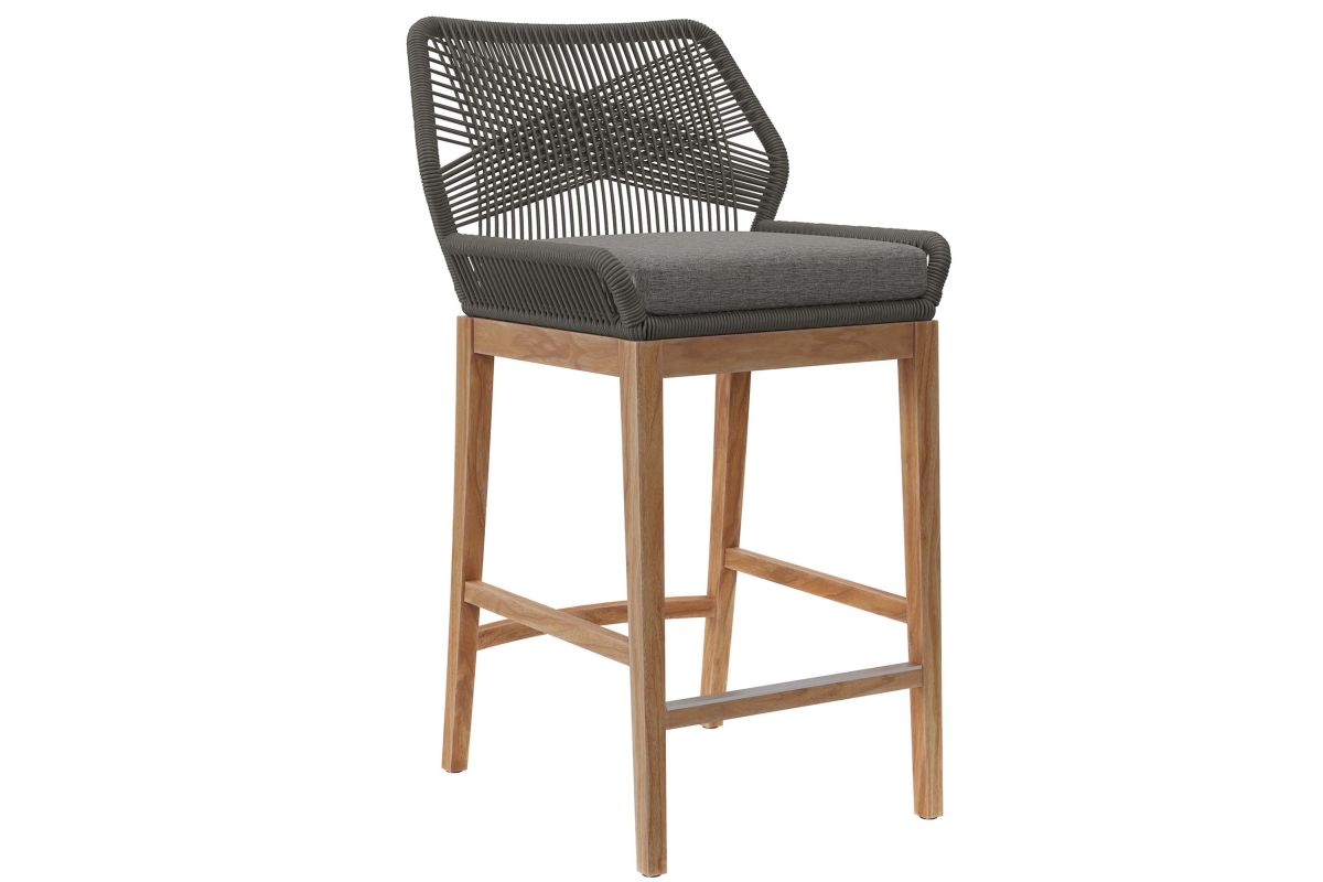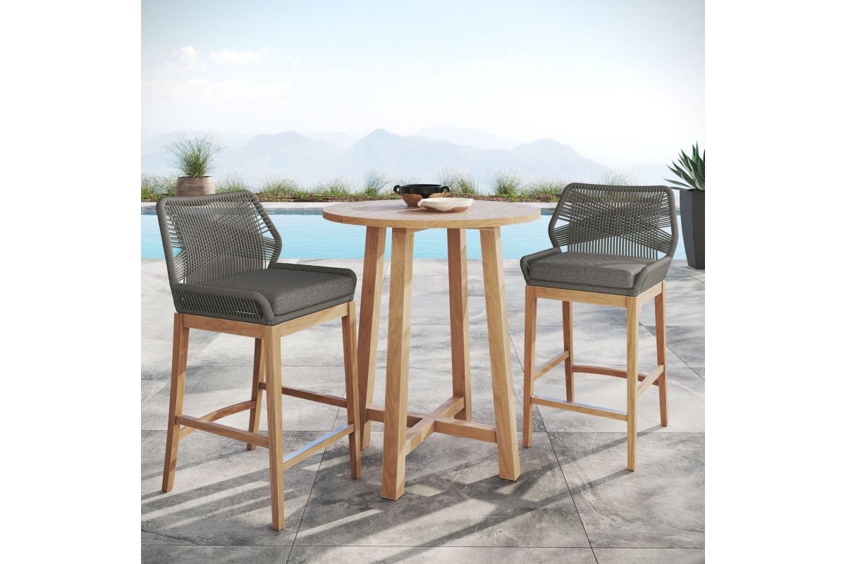 Enjoy the company of family and friends or a peaceful morning around the Wellspring 3-Piece Outdoor Bar Set. Crafted from premium, weather-resistant solid teak, this patio dining set includes a 36" round high-top bar table with a slatted surface and two matching bar-height stools. Both the tall bistro table and stools feature sturdy teak wood bases with non-marking foot caps to protect outdoor flooring, while the table's cross supports enhance stability. The modern bar stools are designed with aluminum seats, woven rope backs, and thick foam-padded cushions for lasting comfort. The cushions include ties for a secure fit and can be easily removed for cleaning. Whether placed on your porch, patio, or in the backyard, this outdoor dining set brings a warm, inviting ambiance, creating the perfect spot for two to enjoy drinks or meals al fresco. Assembly required.