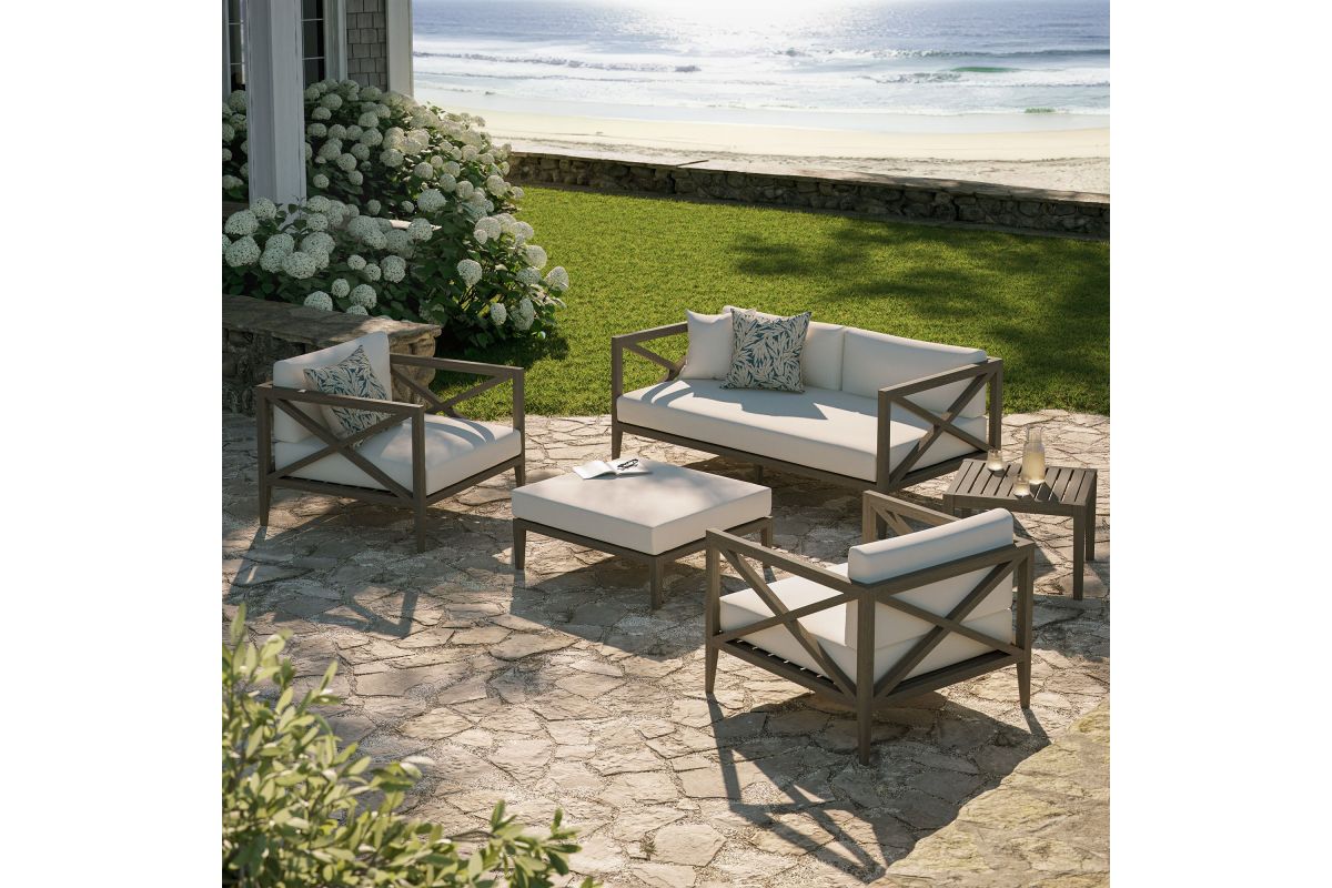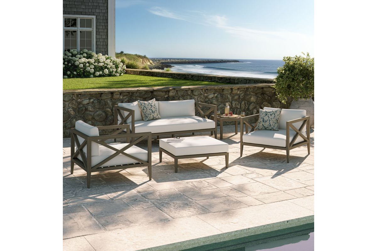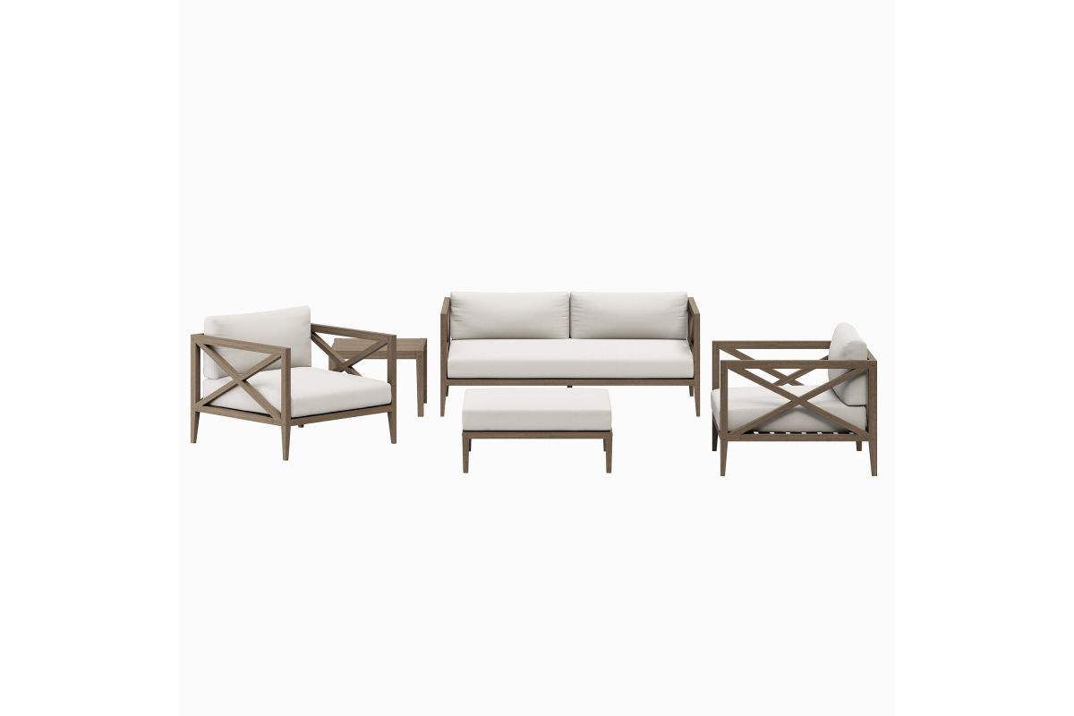 Soak in nature’s beauty with the Northlake 5-Piece Outdoor Furniture Set, featuring a sofa, two armchairs, a matching ottoman, and a side table. All crafted from durable teak, the sofa and armchairs are designed with distinctive cross-back frames for added support and a refined aesthetic, while the ottoman complements the set with a wide, seat and clean, modern look. All three seating pieces include plush, all-weather cushions that are water-resistant, fade-resistant, and quick-drying, providing year-round comfort. Slatted seat bases encourage airflow and lasting durability across the set. The coordinating square side table completes the layout with a smooth slatted top designed for quick drainage, offering a convenient surface for drinks, decor, or outdoor essentials. Perfect for patios, porches, decks, and garden lounges, this 5 piece patio set blends timeless craftsmanship with modern outdoor luxury. Includes non-marking floor glides for added protection. Assembly required.