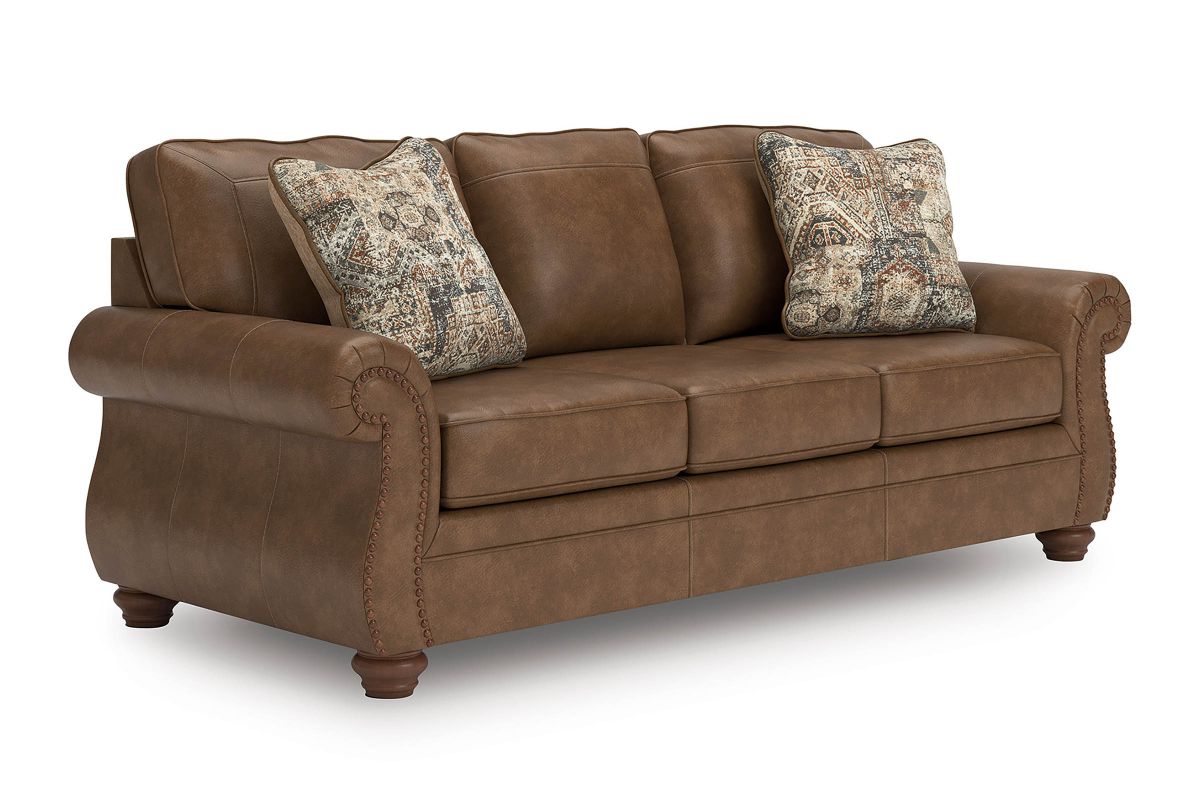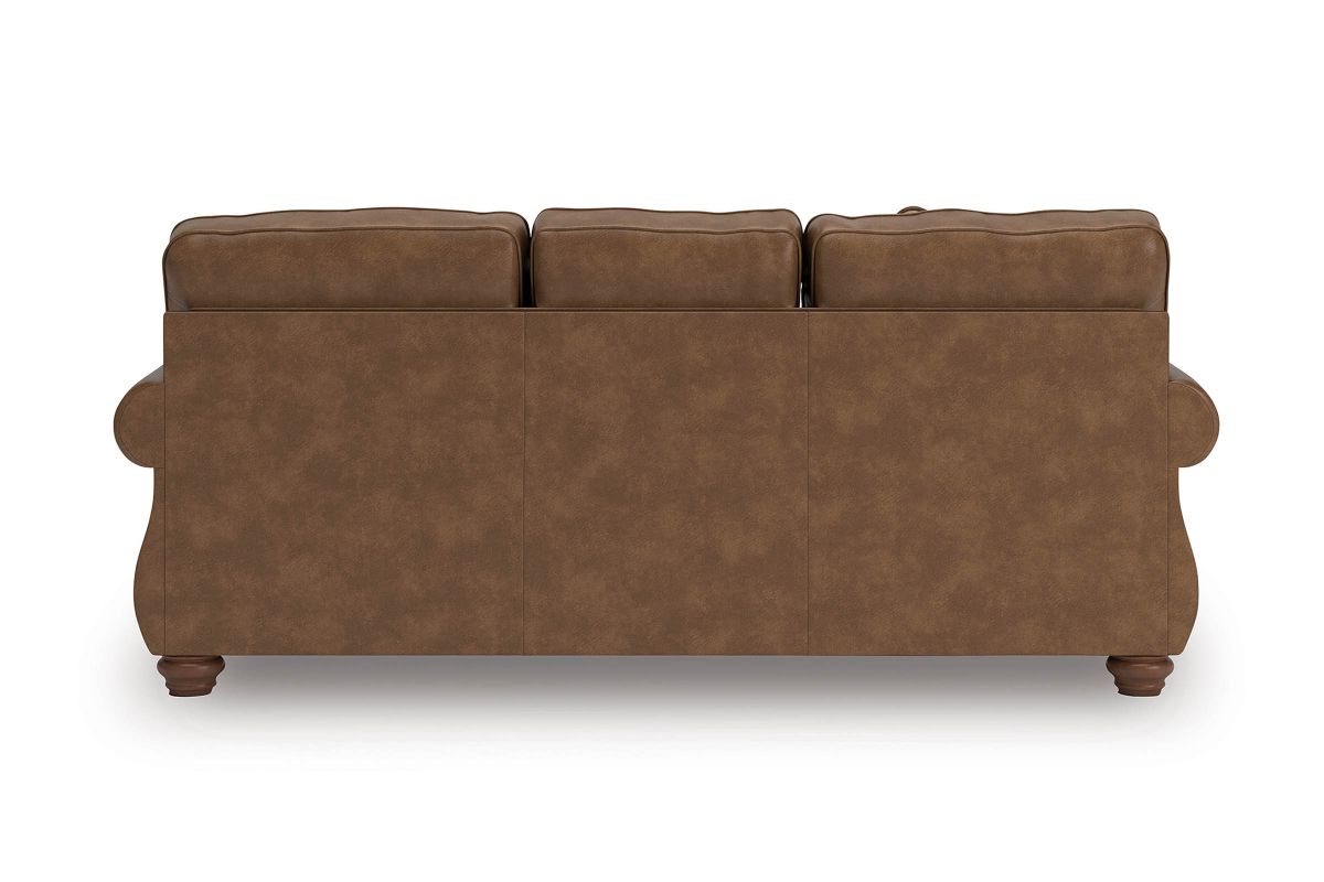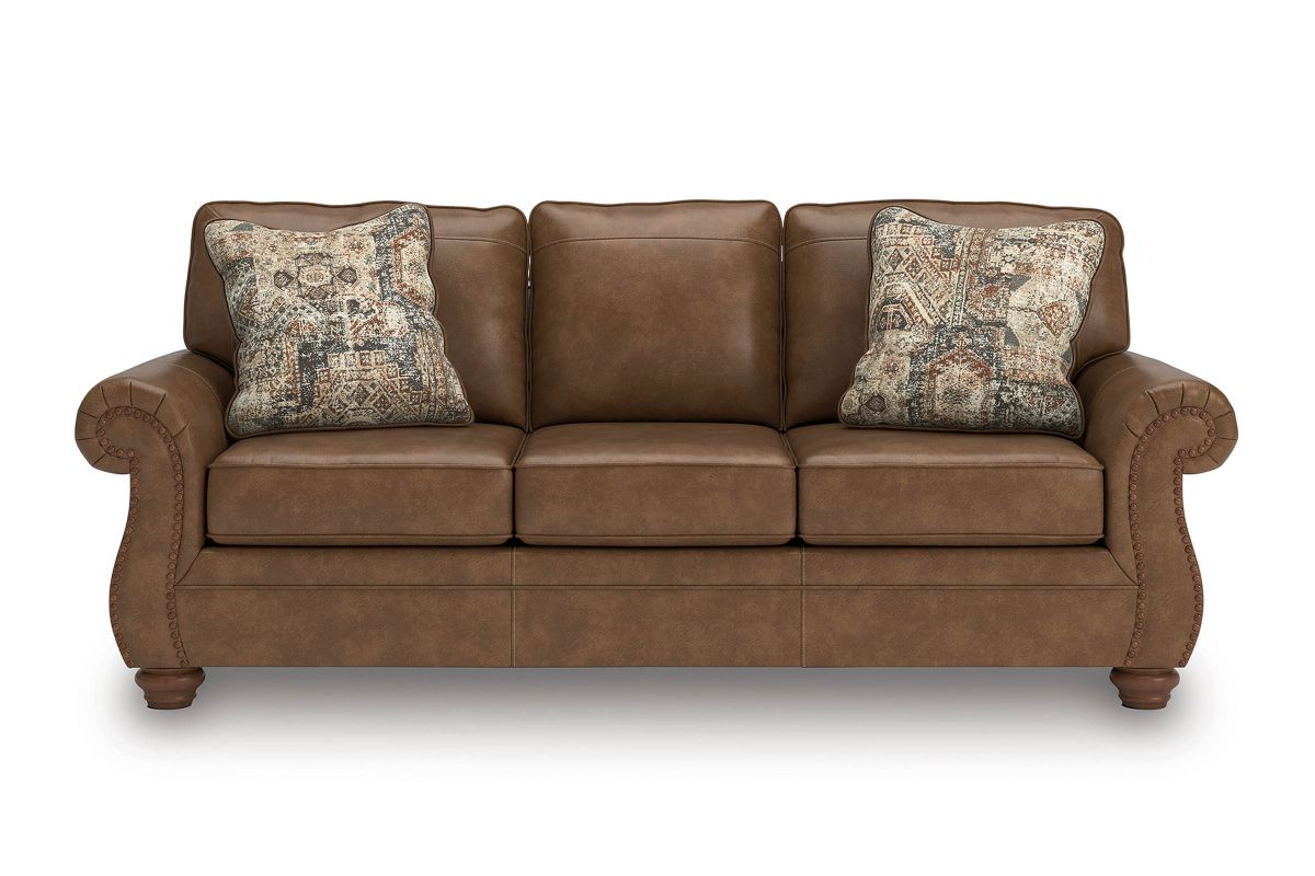 Everyone can have the best seat in the house with the Briar Brown Leather Sofa. Its nailhead trim puts the finishing touches on the traditional roll arms you love. Comfy, durable cushions—wrapped in a rustic yet sophisticated faux leather—keep you feeling relaxed. Chenille pillows in a distressed motif pattern add another layer of comfort. And the sofa's turned legs show that style and quality flow from top to bottom.
