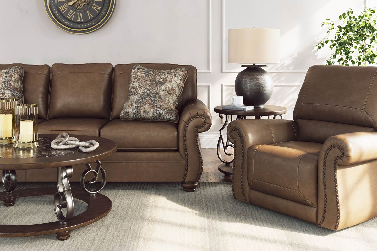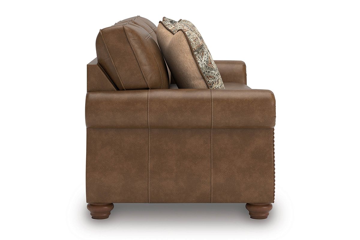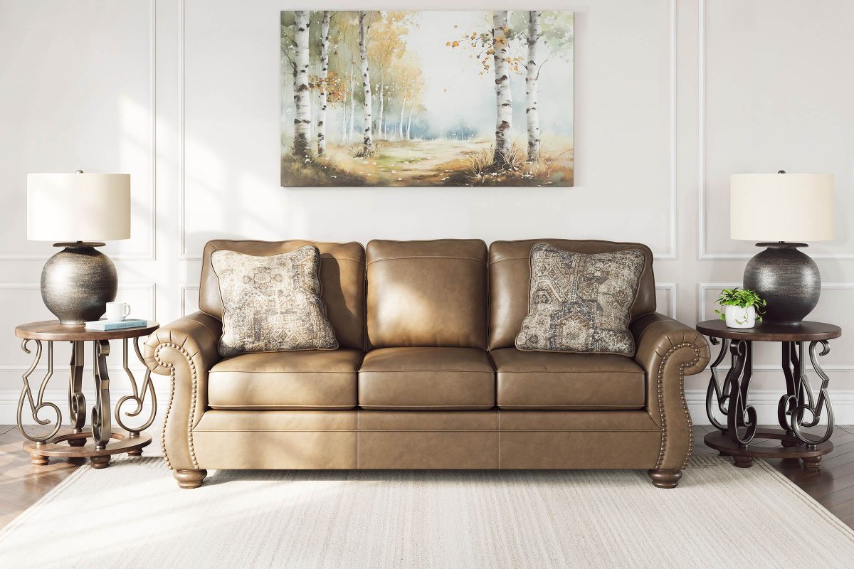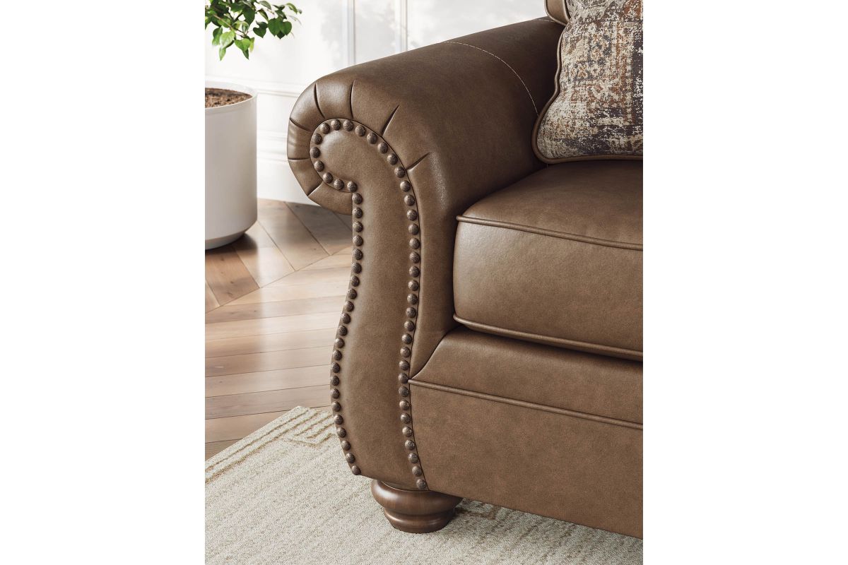 Everyone can have the best seat in the house with the Briar Brown Leather Sofa. Its nailhead trim puts the finishing touches on the traditional roll arms you love. Comfy, durable cushions—wrapped in a rustic yet sophisticated faux leather—keep you feeling relaxed. Chenille pillows in a distressed motif pattern add another layer of comfort. And the sofa's turned legs show that style and quality flow from top to bottom.
