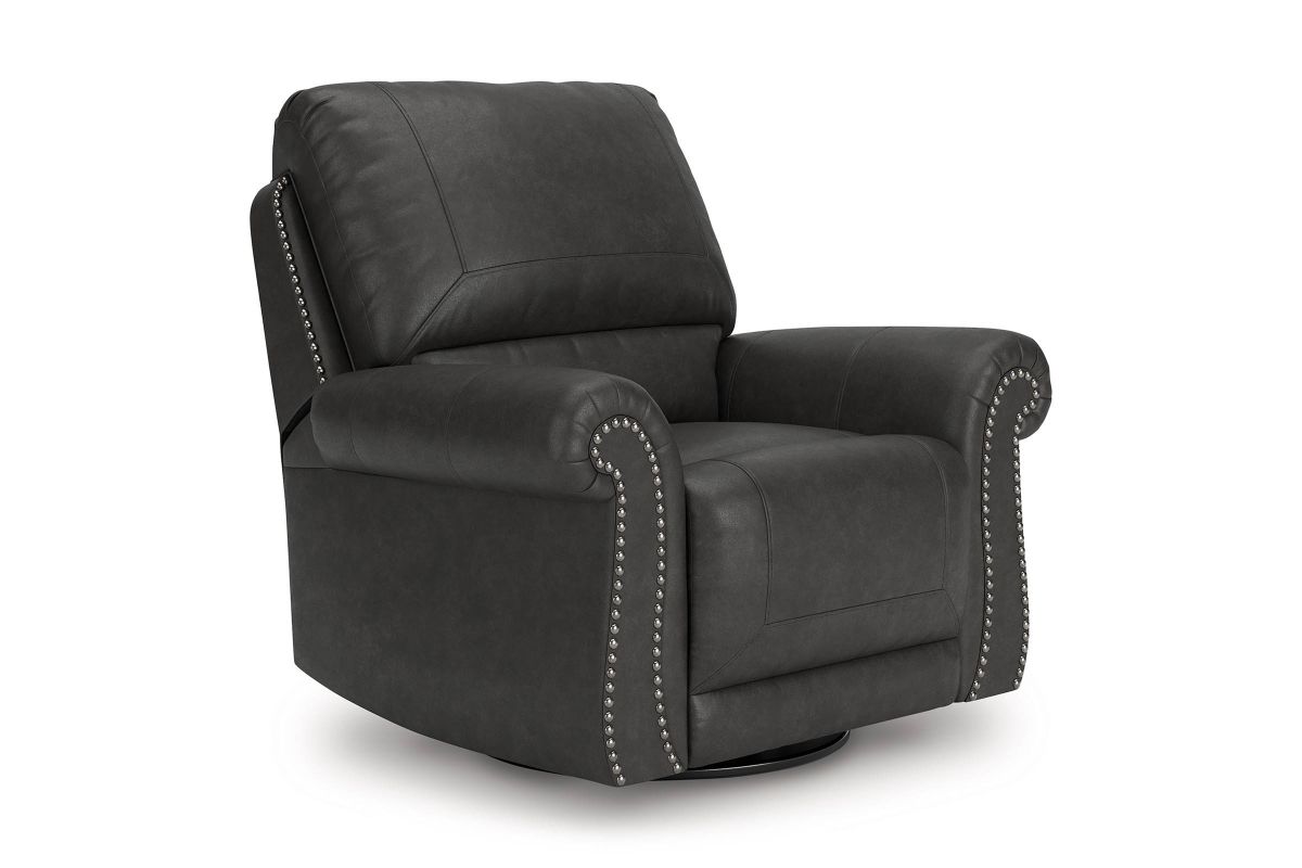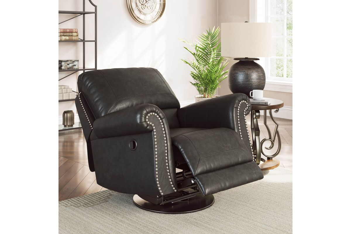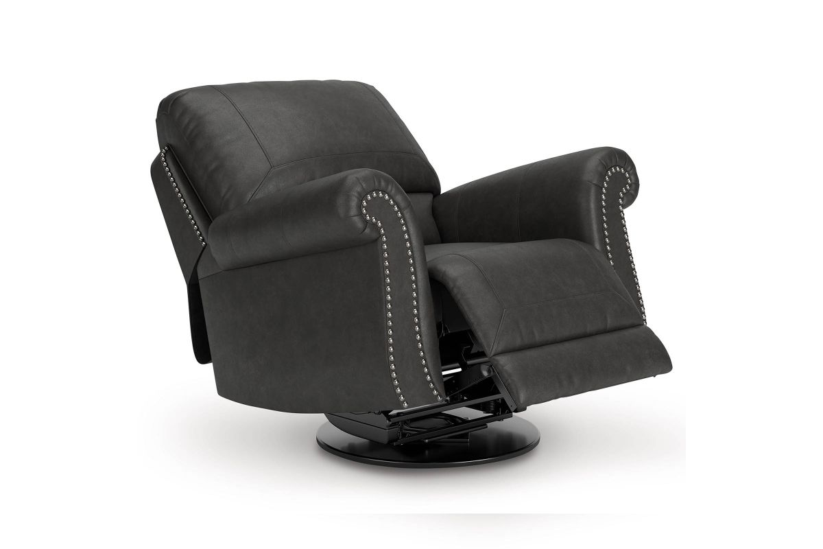 Everyone can have the best seat in the house with the Briar Grey Leather Swivel Gliding Recliner. Its nailhead trim puts the finishing touches on the traditional roll arms you love. The recliner's comfy, durable cushions—wrapped in a rustic yet sophisticated faux leather—keep you feeling relaxed, while its turned legs show that style and quality flow from top to bottom. Plus the smooth reclining motion and 360-degree swivel keep you in the flow of conversation.