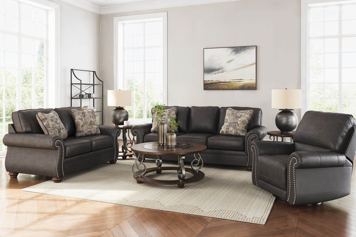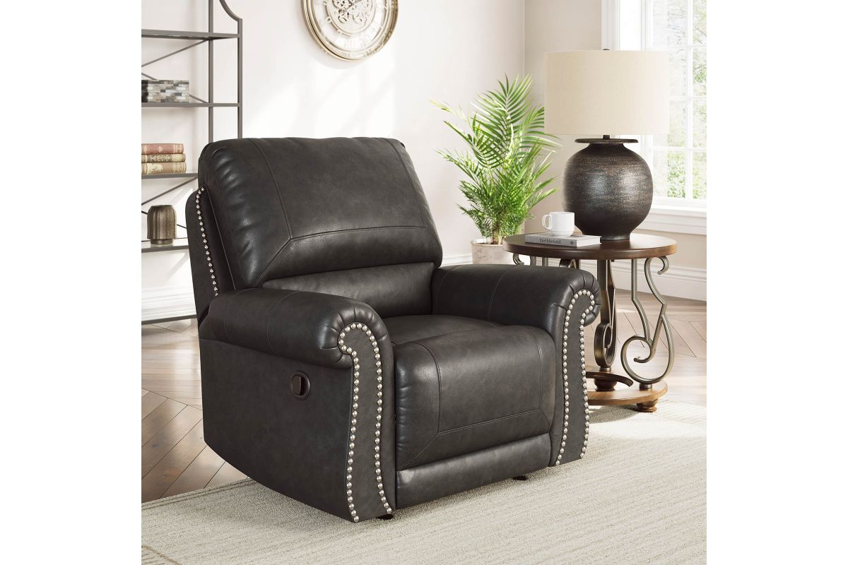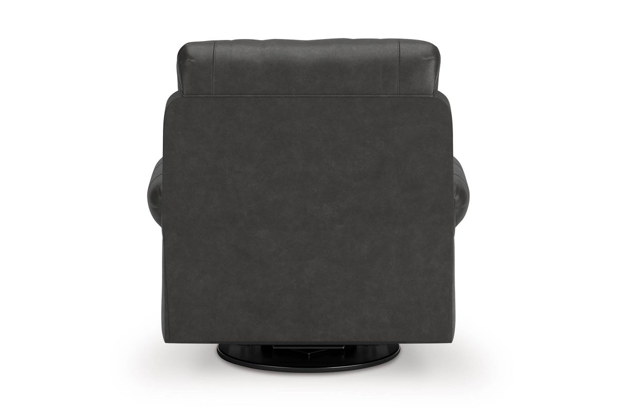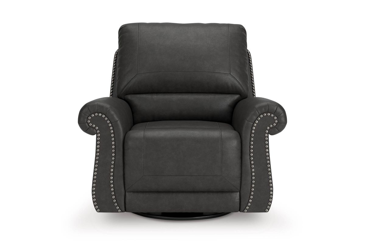 Everyone can have the best seat in the house with the Briar Grey Leather Swivel Gliding Recliner. Its nailhead trim puts the finishing touches on the traditional roll arms you love. The recliner's comfy, durable cushions—wrapped in a rustic yet sophisticated faux leather—keep you feeling relaxed, while its turned legs show that style and quality flow from top to bottom. Plus the smooth reclining motion and 360-degree swivel keep you in the flow of conversation.
