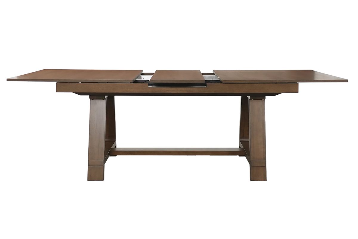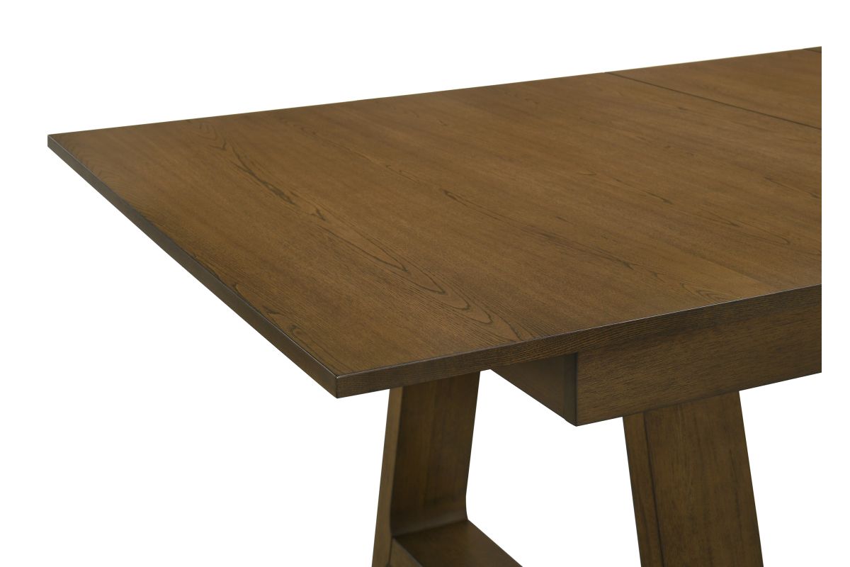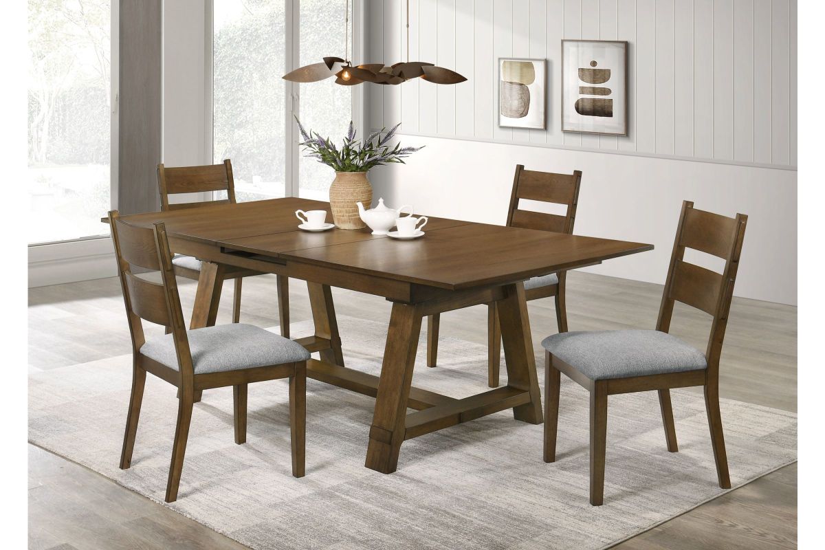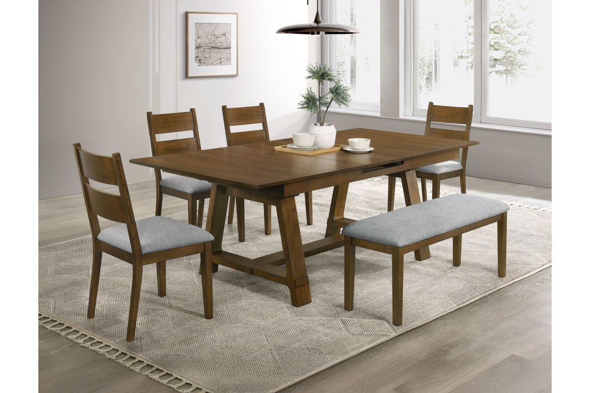 This dining group brings a blend of rustic charm and contemporary elegance to any dining space. Crafted from rich wood with a warm finish, it radiates an inviting feel that’s perfect for family gatherings and stylish entertaining. The sturdy table features a spacious top with a self storing leaf, providing ample room for meals, while the bench adds a casual yet versatile seating option. Each chair is designed with a contoured back and upholstered seat for exceptional comfort, seamlessly combining form and function. The neutral tones and clean lines create a look that effortlessly complements modern and farmhouse aesthetics alike, making it an ideal choice for those who value both style and functionality in their dining area.