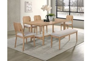 Elevate your dining space with this stylish and modern dining set, designed to blend seamlessly with contemporary and minimalist interiors. Crafted with a warm wood finish, this collection exudes natural charm while offering durability and stability. The sleek, rectangular table features softly rounded edges, creating a welcoming atmosphere for gatherings. Complementing the table, the elegantly designed chairs provide ergonomic support with their curved backrests and plush cushioned seats, ensuring comfort during long meals. The versatile bench adds a dynamic seating option, combining function and aesthetic appeal. Whether hosting family dinners or entertaining guests, this sophisticated dining ensemble brings effortless elegance to any home.