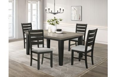 This dining group effortlessly combines farmhouse warmth with modern sophistication, creating a captivating focal point for any dining space. The table features a rich, two-tone design with a beautifully finished wood top and contrasting dark legs, delivering a striking visual appeal that suits various decor styles. The ladder-back chairs and tufted bench offer both style and comfort, with plush upholstery in a versatile neutral tone that invites guests to linger. With its blend of rustic charm and contemporary flair, this set is perfect for both intimate family meals and lively gatherings, making your dining area a stylish and welcoming retreat.