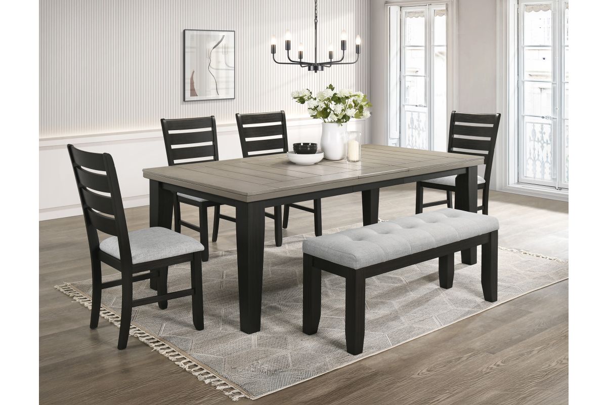 This dining group effortlessly combines farmhouse warmth with modern sophistication, creating a captivating focal point for any dining space. The table features a rich, two-tone design with a beautifully finished wood top and contrasting dark legs, delivering a striking visual appeal that suits various decor styles. The ladder-back chairs and tufted bench offer both style and comfort, with plush upholstery in a versatile neutral tone that invites guests to linger. With its blend of rustic charm and contemporary flair, this set is perfect for both intimate family meals and lively gatherings, making your dining area a stylish and welcoming retreat.
