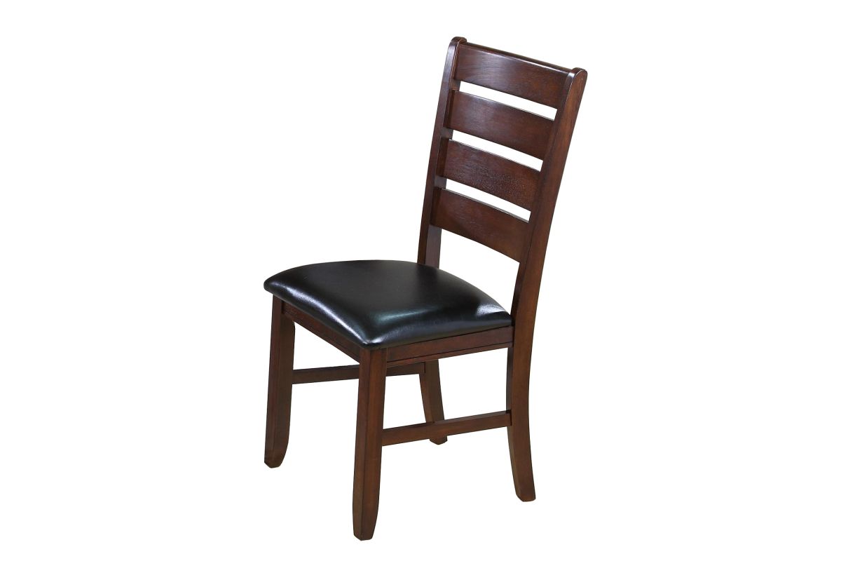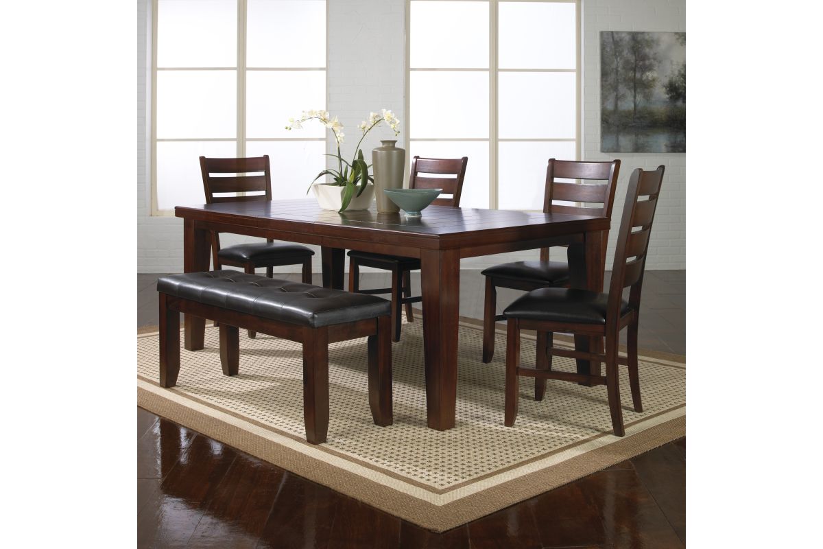 This dining group exudes timeless sophistication with its rich, deep finish and elegant design. The sturdy table provides a commanding presence, perfect for anchoring your dining space and creating a welcoming atmosphere. The matching chairs feature ladder backs and are cushioned in luxurious faux leather, adding both style and comfort to every seating experience. The bench, with its tufted top, introduces a contemporary touch while offering versatile seating options for guests. The combination of clean lines, bold tones, and refined details makes this set a standout piece, ideal for those seeking to enhance their dining room with a blend of classic and modern elements.