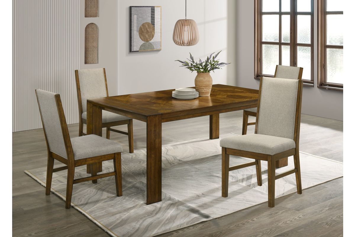 Transform your dining space into a haven of warmth and style with this stunning ensemble, perfect for both casual and formal settings. The tailored chairs and tufted bench are upholstered in a soft neutral fabric, providing luxurious comfort and a modern touch. The table's alternating wood tones and textures create depth and visual interest, offering a timeless aesthetic with a handcrafted feel. The detailed arrangement emphasizes the beauty of the natural material while adding a sophisticated and dynamic touch to any surface, making it perfect for a statement piece or a versatile complement to a variety of styles. Designed to enhance both functionality and aesthetics, this set creates an inviting atmosphere for family meals, celebrations, or quiet evenings at home.