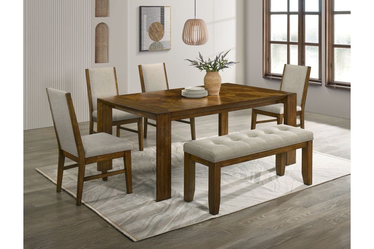 Transform your dining space into a haven of warmth and style with this stunning ensemble, perfect for both casual and formal settings. The tailored chairs and tufted bench are upholstered in a soft neutral fabric, providing luxurious comfort and a modern touch. The table's alternating wood tones and textures create depth and visual interest, offering a timeless aesthetic with a handcrafted feel. The detailed arrangement emphasizes the beauty of the natural material while adding a sophisticated and dynamic touch to any surface, making it perfect for a statement piece or a versatile complement to a variety of styles. Designed to enhance both functionality and aesthetics, this set creates an inviting atmosphere for family meals, celebrations, or quiet evenings at home.