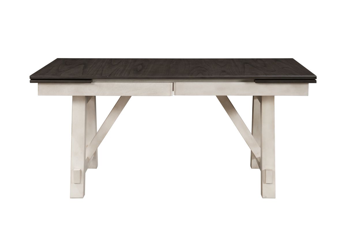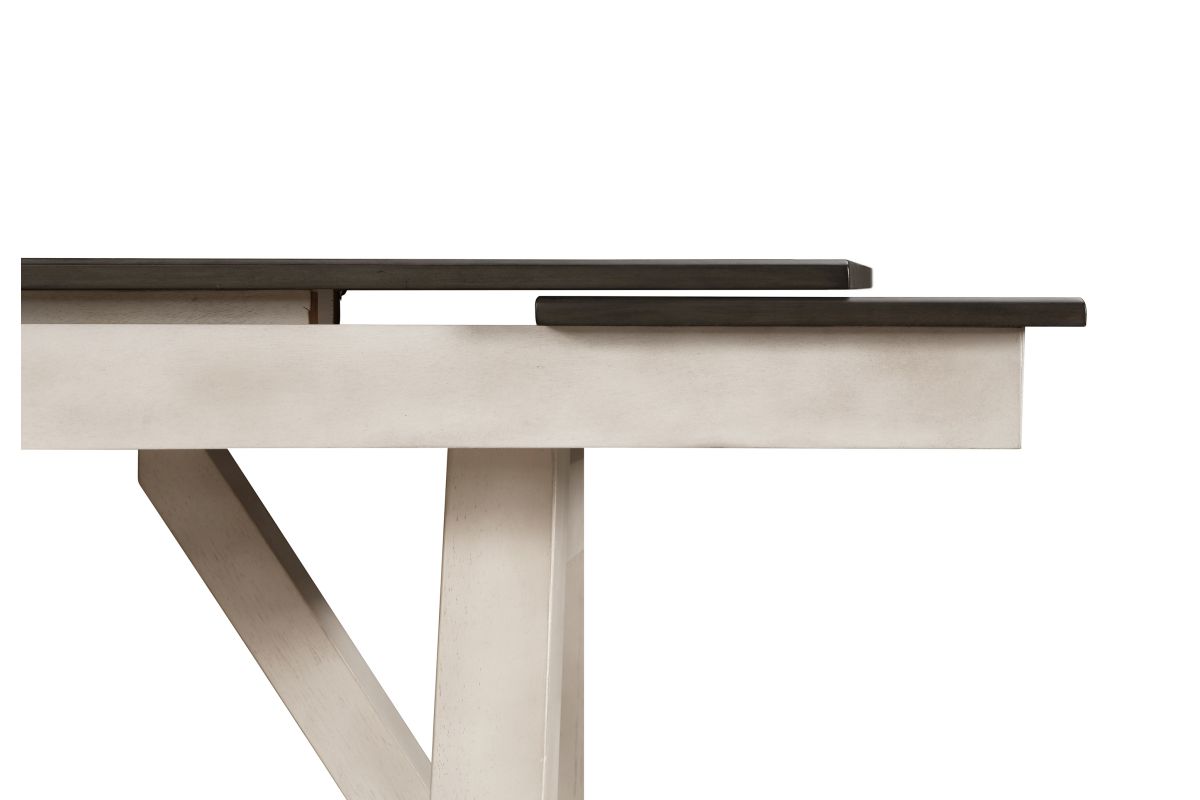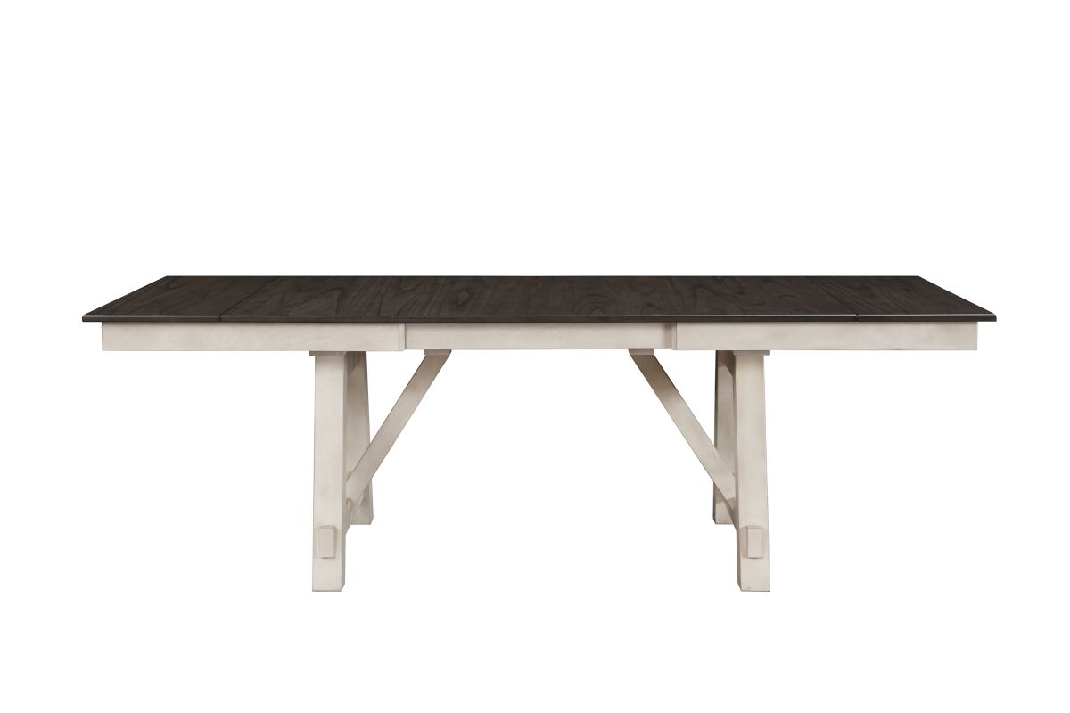 Create a warm and inviting dining space with this beautifully designed set that perfectly blends rustic charm with modern elegance. The two-tone finish features a striking dark tabletop with dual draw leaves contrasted with a soft, distressed base, adding a farmhouse-inspired touch to any home. The trestle-style table provides a sturdy foundation, making it ideal for both casual family meals and festive gatherings. Complementing the table, the matching chairs and bench feature plush upholstered seating for superior comfort, while the slatted chair backs enhance the overall aesthetic. Whether you're hosting or enjoying everyday dining, this set delivers style, durability, and a welcoming ambiance.
