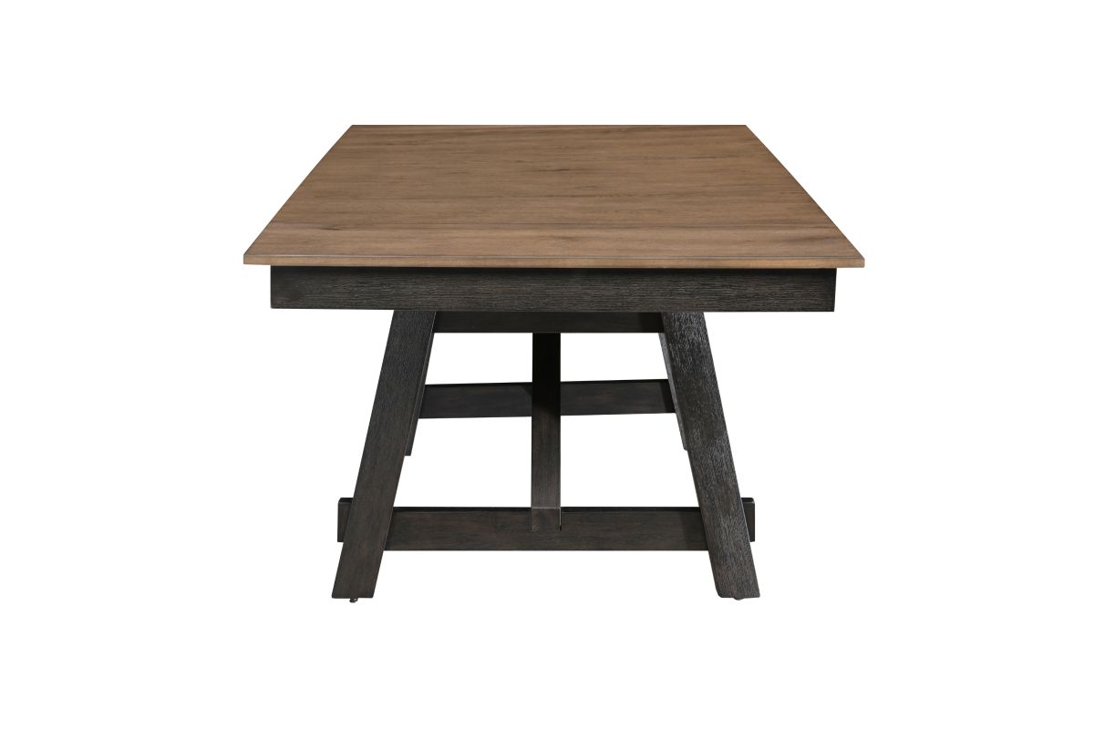 Transform your dining space with this stunning blend of rustic charm and modern elegance. Featuring a rich two-tone finish, the dual draw leaf tabletop beautifully contrasts with the deep, bold base, creating a striking yet inviting aesthetic. The trestle-style table offers both stability and timeless appeal, making it perfect for family gatherings or intimate dinners. Complementing the table, the matching chairs and bench feature upholstered seats for added comfort, while the slatted chair backs enhance the design with a contemporary touch. Whether hosting guests or enjoying everyday meals, this set delivers style, durability, and a welcoming atmosphere.