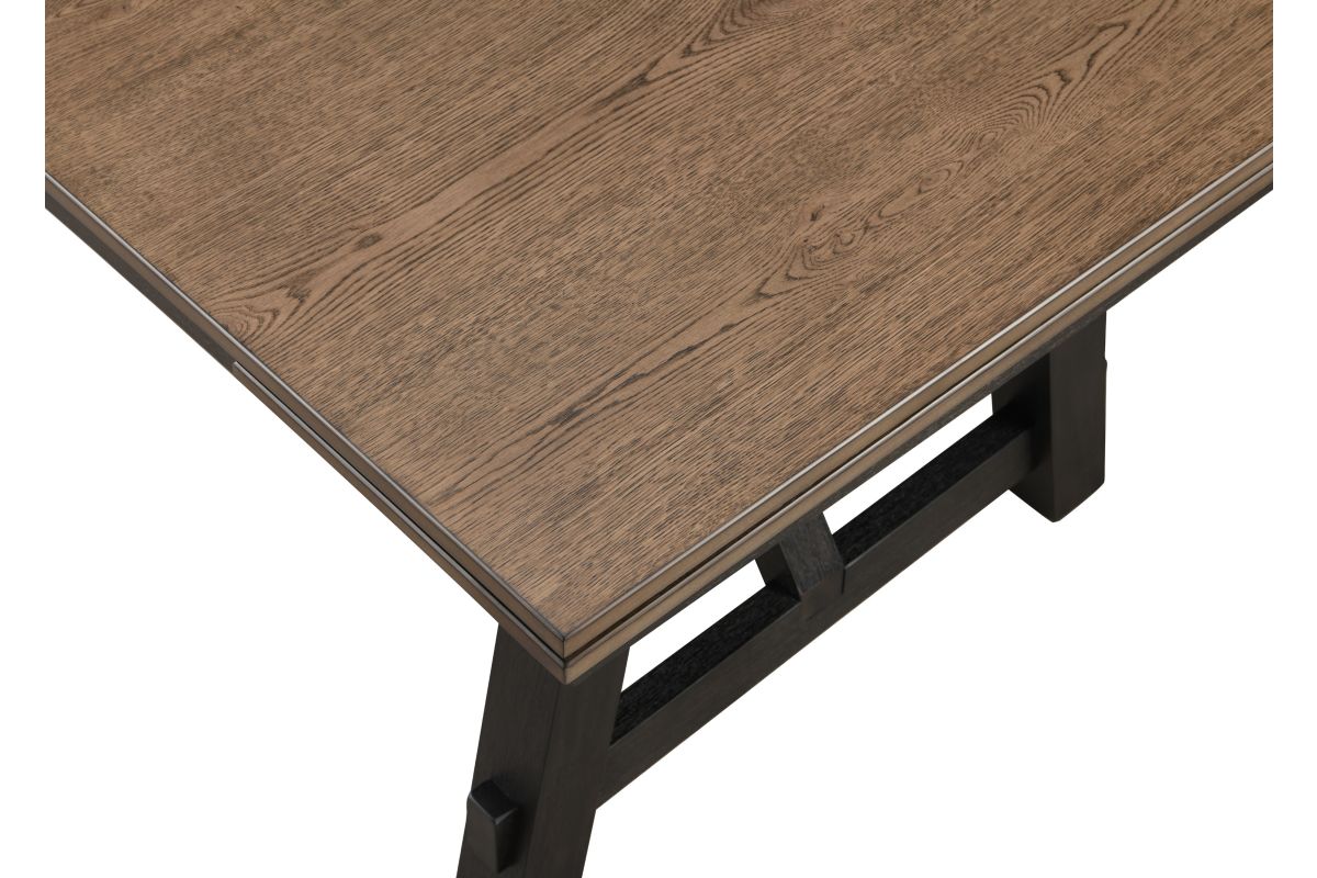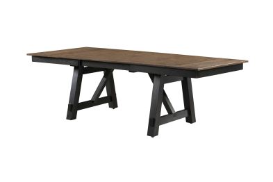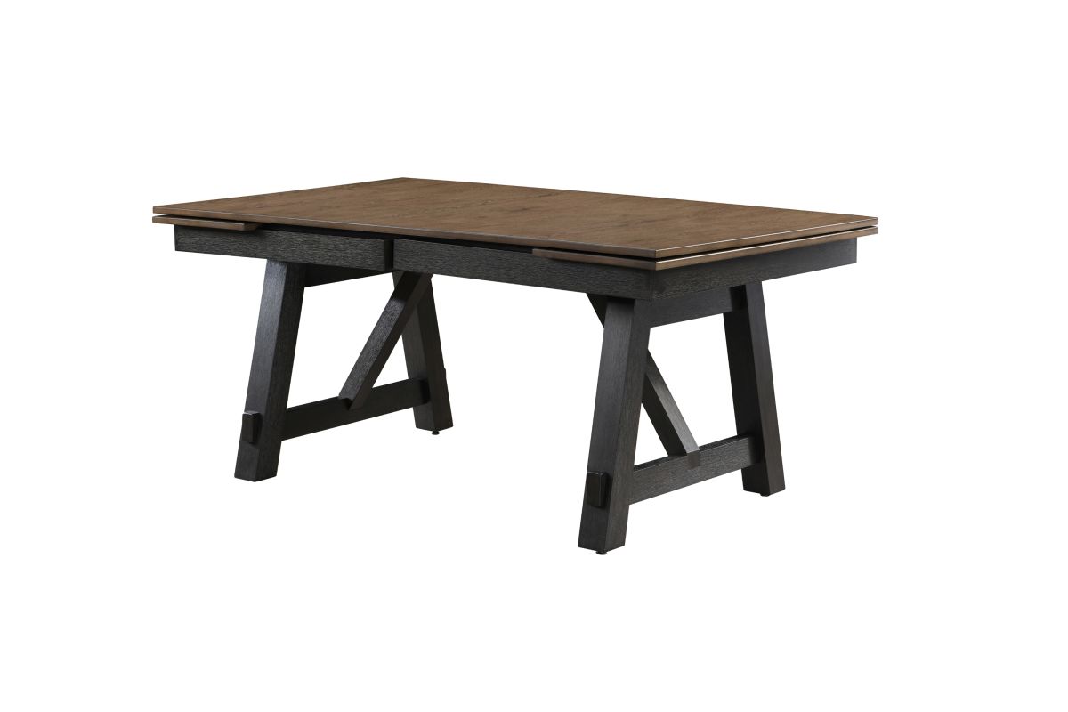 Transform your dining space with this stunning blend of rustic charm and modern elegance. Featuring a rich two-tone finish, the dual draw leaf tabletop beautifully contrasts with the deep, bold base, creating a striking yet inviting aesthetic. The trestle-style table offers both stability and timeless appeal, making it perfect for family gatherings or intimate dinners. Complementing the table, the matching chairs and bench feature upholstered seats for added comfort, while the slatted chair backs enhance the design with a contemporary touch. Whether hosting guests or enjoying everyday meals, this set delivers style, durability, and a welcoming atmosphere.