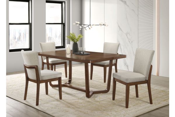 Transform your dining experience into a celebration of style and comfort with the Salerno Beige/Brown Dining Set by Crown Mark. Imagine gathering family and friends around a statement dining table that sets the tone for sophistication, while plushly upholstered chairs and a versatile matching bench invite everyone to linger longer after each meal. This refined dining collection gracefully fuses mid-century modern influences with transitional elegance, making it the perfect centerpiece for both everyday breakfasts and formal entertaining in a modern home, urban apartment, or open-concept condo. Whether hosting a lively dinner party or enjoying quiet moments with loved ones, the Salerno Set’s clean lines, warm wood finish, and unique sculptural V-leg base create a welcoming ambiance, while the ergonomic seating ensures comfort for every guest. Luna Furniture introduces Salerno Beige/Brown Dining Set to enhance the beauty of your living spaces.
