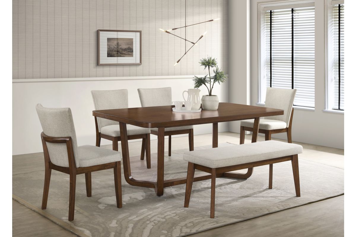 Elevate your dining space with this sleek and sophisticated dining set, designed to seamlessly blend modern elegance with mid-century inspiration. The beautifully crafted table features a warm wood finish and a unique sculptural base, adding a refined touch to any setting. Complementing the table, the gracefully curved chairs and bench boast plush upholstered seats and soft fabric backrests, ensuring superior comfort for every meal. With its clean lines and timeless design, this dining collection is perfect for those who appreciate both form and function, making every gathering a stylish and inviting experience.
