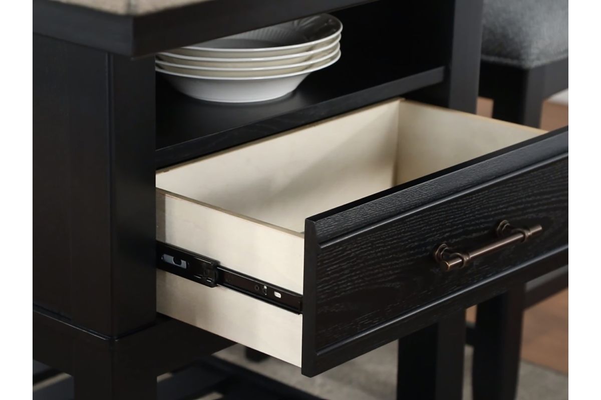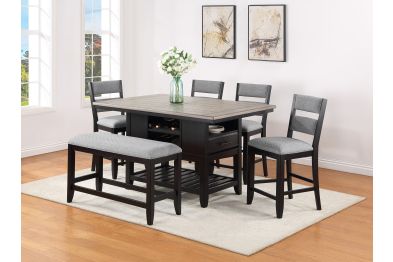 Bring a fresh look to your dining space with this breezy counter height group. The table has an array of design features, including drawers, bottle storage, and an open bottom shelf. Ladderback chairs and bench are upholstered in a Chevron pattern fabric with piping detail.