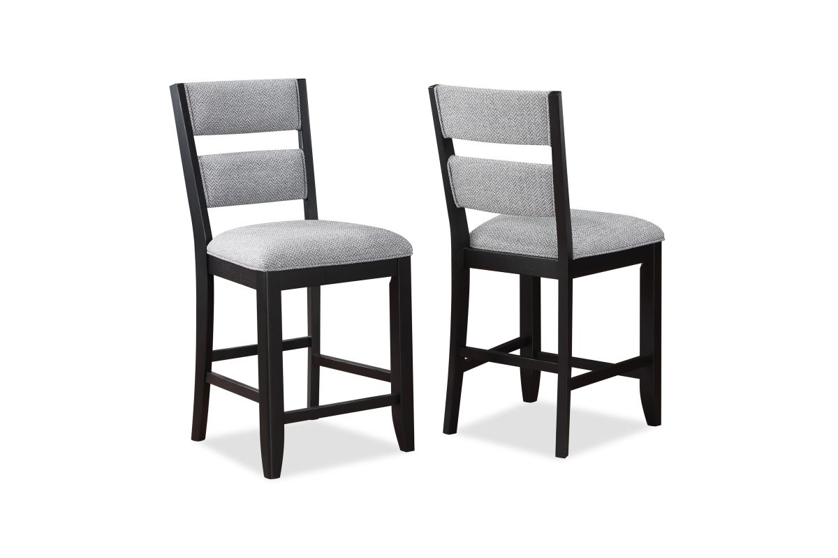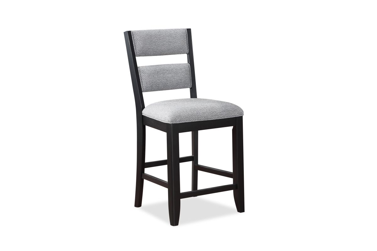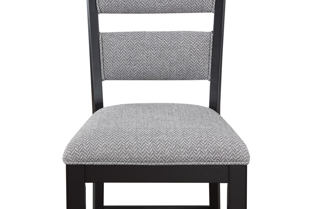 Bring a fresh look to your dining space with this breezy counter height group. The table has an array of design features, including drawers, bottle storage, and an open bottom shelf. Ladderback chairs and bench are upholstered in a Chevron pattern fabric with piping detail.