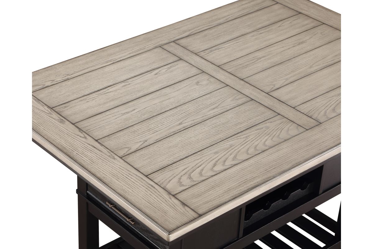 Bring a fresh look to your dining space with this breezy counter height group. The table has an array of design features, including drawers, bottle storage, and an open bottom shelf. Ladderback chairs and bench are upholstered in a Chevron pattern fabric with piping detail.