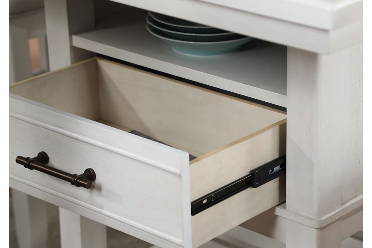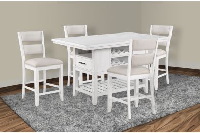 Bring a fresh look to your dining space with this breezy counter height group. The table has an array of design features, including drawers, bottle storage, and an open bottom shelf. Ladderback chairs and bench are upholstered in a Chevron pattern fabric with piping detail.