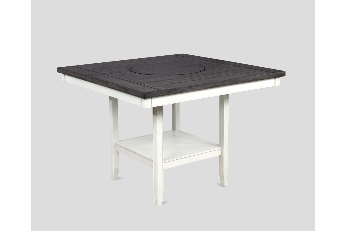 Transform your dining area with this elegant counter height dining set, designed to bring a touch of modern farmhouse charm to your home. The centerpiece table features a stunning dark wood top with built-in turntable that contrasts beautifully with the distressed white base, creating a striking visual appeal. Accompanied by four plushly upholstered chairs and a versatile bench, all in a soft gray fabric, this set ensures comfort and style for every meal. The high-quality construction guarantees durability, while the classic design elements blend seamlessly with contemporary or traditional décor. Perfect for both intimate family dinners and larger gatherings, this set promises to enhance your dining experience with its inviting ambiance and exceptional functionality.