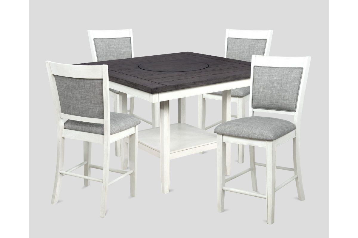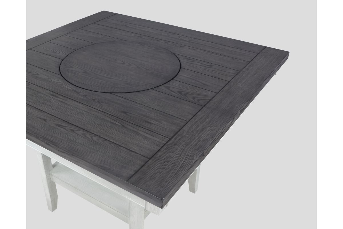 Transform your dining area with this elegant counter height dining set, designed to bring a touch of modern farmhouse charm to your home. The centerpiece table features a stunning dark wood top with built-in turntable that contrasts beautifully with the distressed white base, creating a striking visual appeal. Accompanied by four plushly upholstered chairs and a versatile bench, all in a soft gray fabric, this set ensures comfort and style for every meal. The high-quality construction guarantees durability, while the classic design elements blend seamlessly with contemporary or traditional décor. Perfect for both intimate family dinners and larger gatherings, this set promises to enhance your dining experience with its inviting ambiance and exceptional functionality.