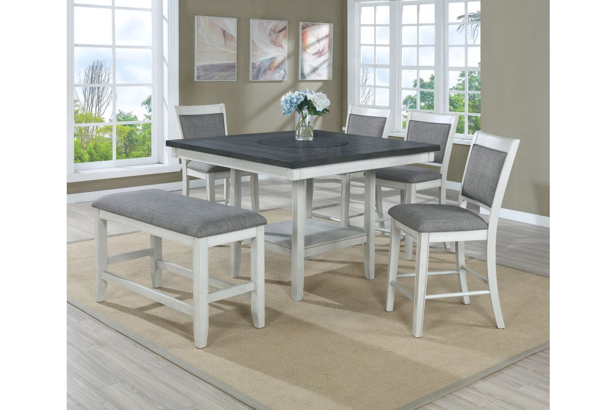 Transform your dining area with this elegant counter height dining set, designed to bring a touch of modern farmhouse charm to your home. The centerpiece table features a stunning dark wood top with built-in turntable that contrasts beautifully with the distressed white base, creating a striking visual appeal. Accompanied by four plushly upholstered chairs and a versatile bench, all in a soft gray fabric, this set ensures comfort and style for every meal. The high-quality construction guarantees durability, while the classic design elements blend seamlessly with contemporary or traditional décor. Perfect for both intimate family dinners and larger gatherings, this set promises to enhance your dining experience with its inviting ambiance and exceptional functionality.