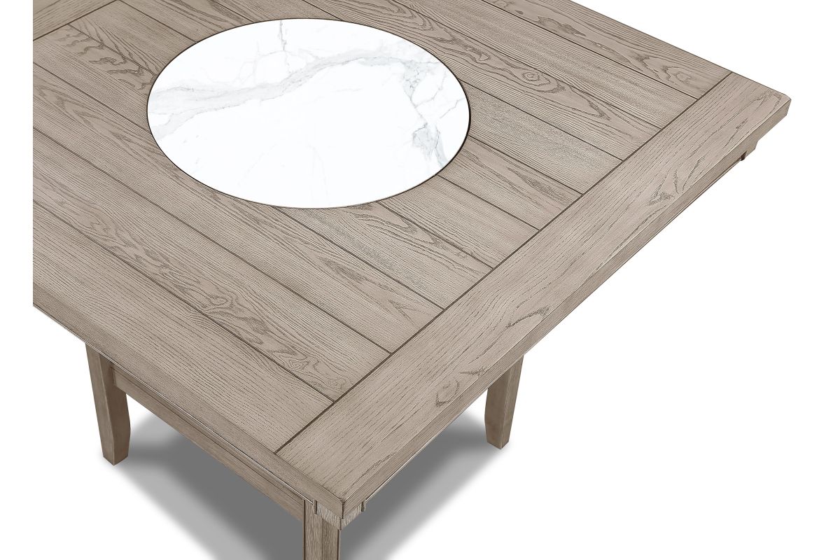 Elevate your dining experience with this elegant counter height dining set, designed to blend seamlessly with any modern or rustic décor. The set features a spacious, finely crafted table with a built-in faux marble turntable and open lower shelf in a weathered white oak finish, exuding a timeless charm that enhances the warmth and appeal of your dining area.