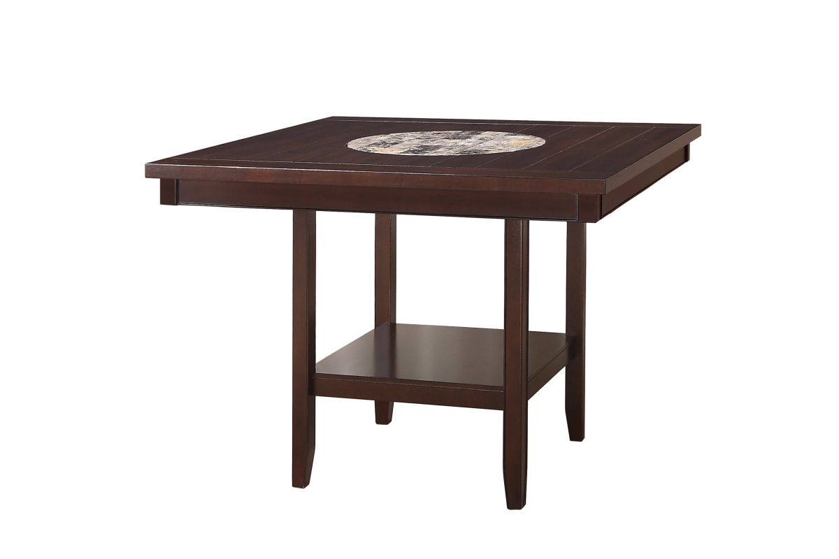 Upgrade your dining space with this luxurious counter height dining set, designed for both style and comfort. The set features a rich dark finish that exudes sophistication, making it a perfect centerpiece for any dining room. The table boasts a spacious, finely crafted top with a beautiful faux plank finish and built-in turntable, supported by a sturdy base that ensures stability and durability. Accompanying the table are four elegant chairs all upholstered in plush, black faux leather that provides a sleek, modern look while offering supreme comfort. The padded seats and high backs are designed to enhance your dining experience, making every meal a pleasure. Ideal for both casual family meals and more formal gatherings, this set is sure to make a lasting impression in your home.