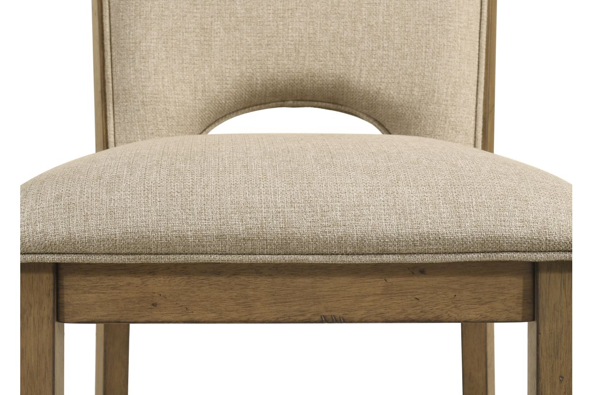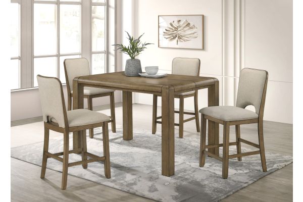 Warm and inviting, this counter height dining group brings a natural charm to the home with its rustic wood tones and clean, understated lines. The rectangular table features a subtly rounded edge and a durable, plank-style top that extends to accommodate extra guests, making it ideal for both everyday dining and special gatherings. Upholstered chairs and bench offer padded seating in a soft, neutral fabric that enhances comfort while complementing the warm wood finish. The design balances casual elegance with practical versatility, creating a welcoming atmosphere perfect for modern family living.