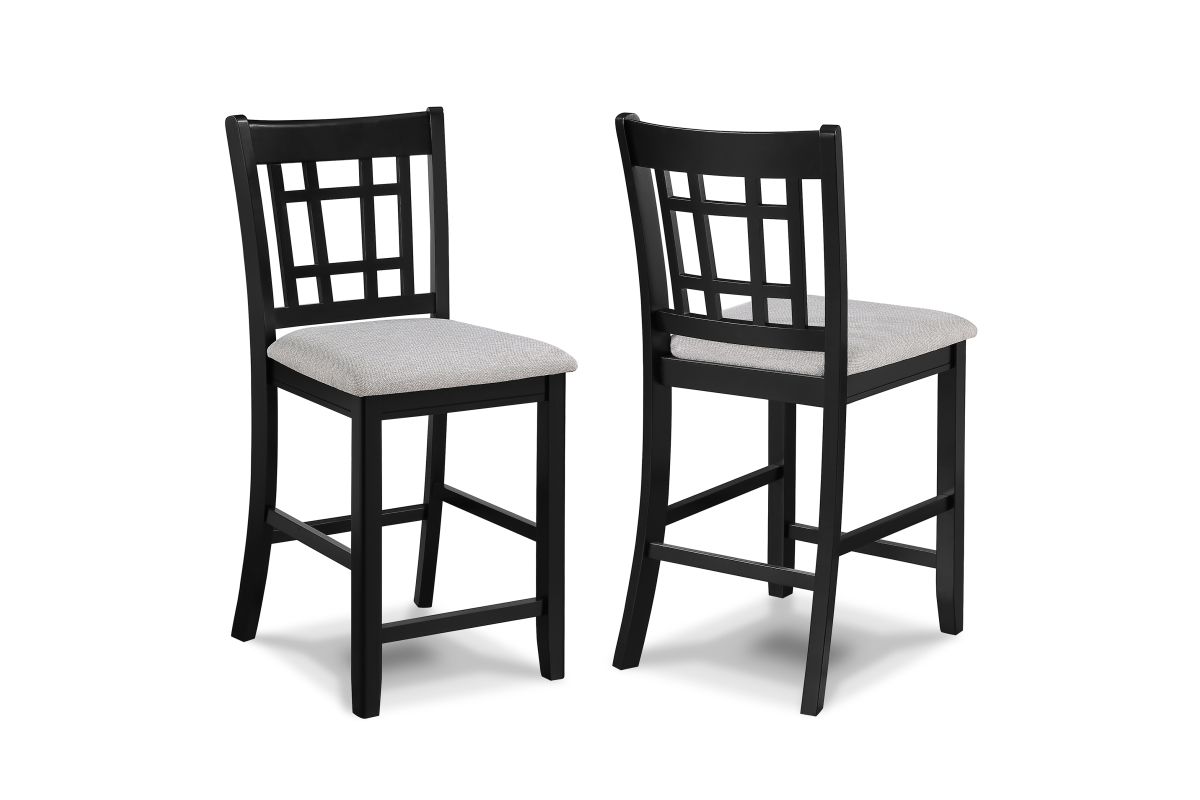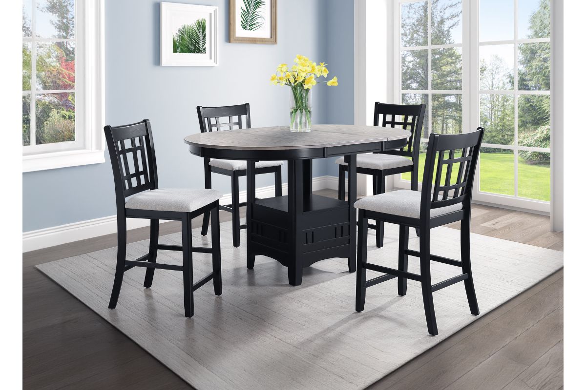 Discover practicality and style with our dining group. With a straightforward design, this set is perfect for everyday meals and casual gatherings. The grid-back chairs offer supportive seating, while the cushioned seats ensure comfort. With its under-table shelf, the table provides a handy spot for dining essentials.