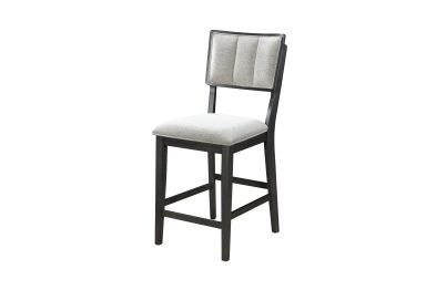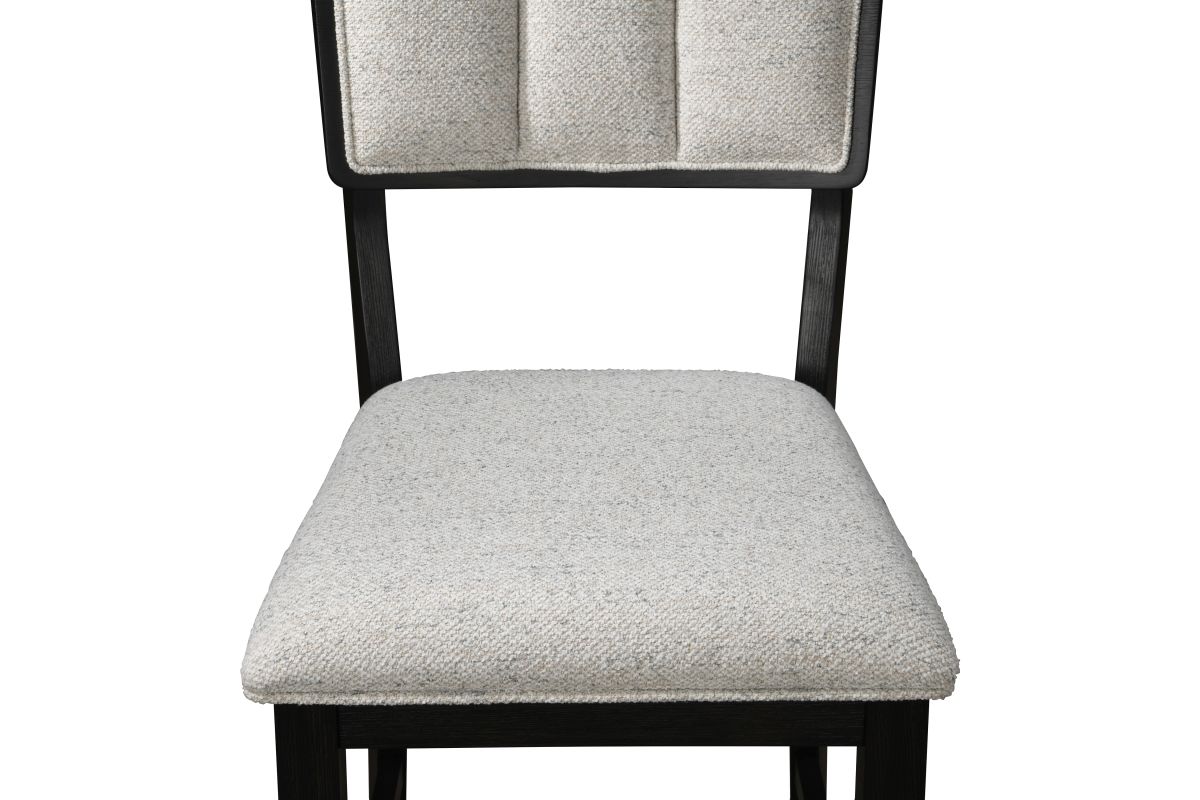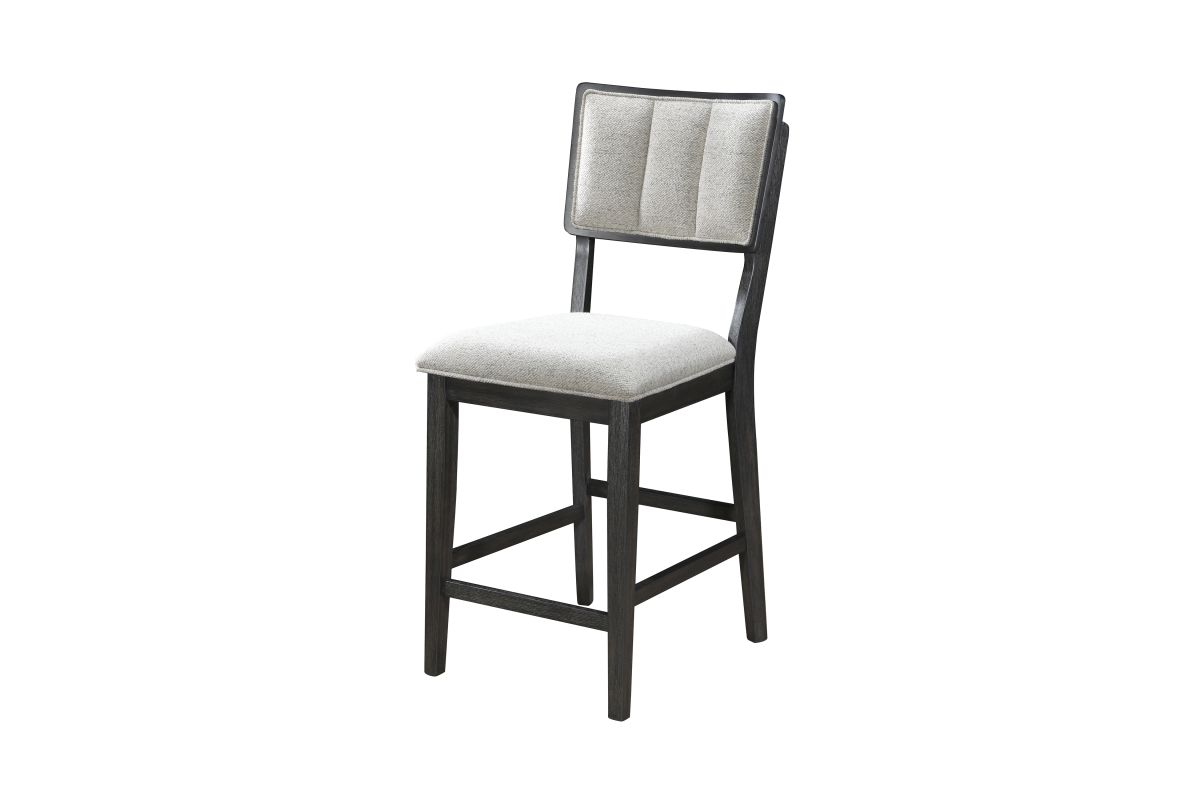 This counter-height dining group embodies a chic, contemporary style with its sleek design and elegant finishes. The ensemble features a robust, round table with a striking wood veneer top that showcases the natural grain, adding a warm, organic touch to the modern silhouette.Surrounding the table are high-back chairs, upholstered in a textured, light fabric that contrasts beautifully with their dark wooden frames, offering comfort and sophistication.