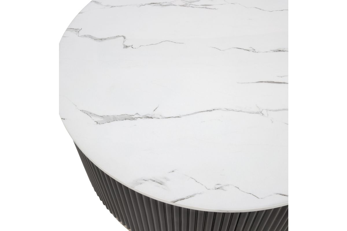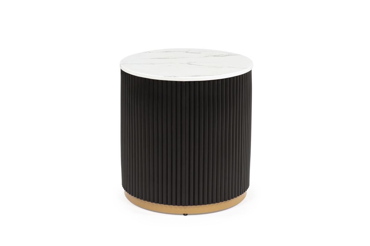 Elevate your living space with this elegantly modern end table, designed to bring both sophistication and functionality to your home. Featuring a luxurious marble-inspired top, this group effortlessly exudes timeless elegance, while the sleek, vertically reeded base in a deep, refined hue adds a contemporary flair. The subtle yet striking gold-finished foundation enhances the upscale aesthetic, creating a perfect balance of opulence and understated charm. Whether placed together for a cohesive statement or used separately to complement your space, this table is the epitome of modern luxury and refined taste.