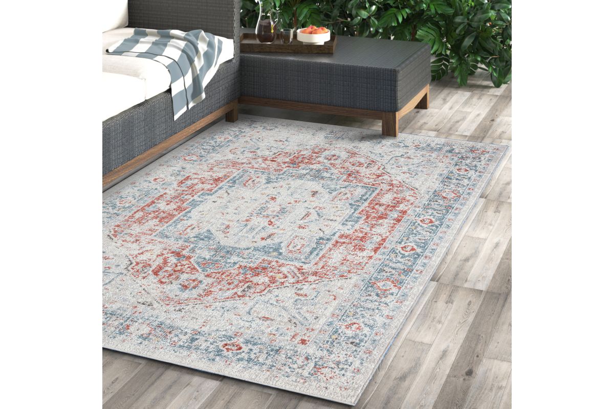 Transform your space with a perfect balance of durability and style with this versatile indoor/outdoor area rug. A bordered faded medallion with delicate distressing graces this piece from edge to edge in shades of red, gray, and blue, creating an eye-catching foundation for patios, decks, sunrooms, living rooms, bedrooms, and any area indoors or out. Each rug is power loomed using traditional techniques out of polypropylene fibers, which allow you to enjoy high-end design without sacrificing comfort or durability. Perfect for a wide range of decor styles and ages from adult to kids, this beautiful rug will do well in any area of your home. The performance materials and construction make this rug fade, stain, and moisture resistant - perfect for busy homes with children and pet friendly.
