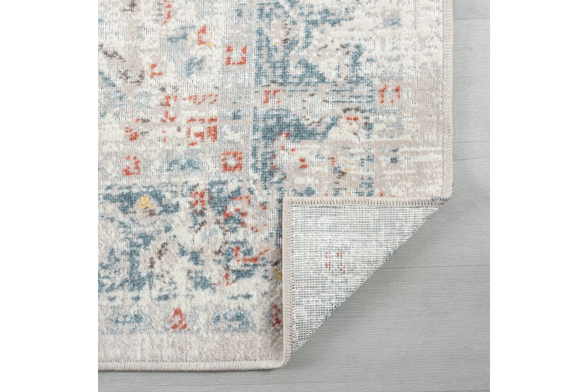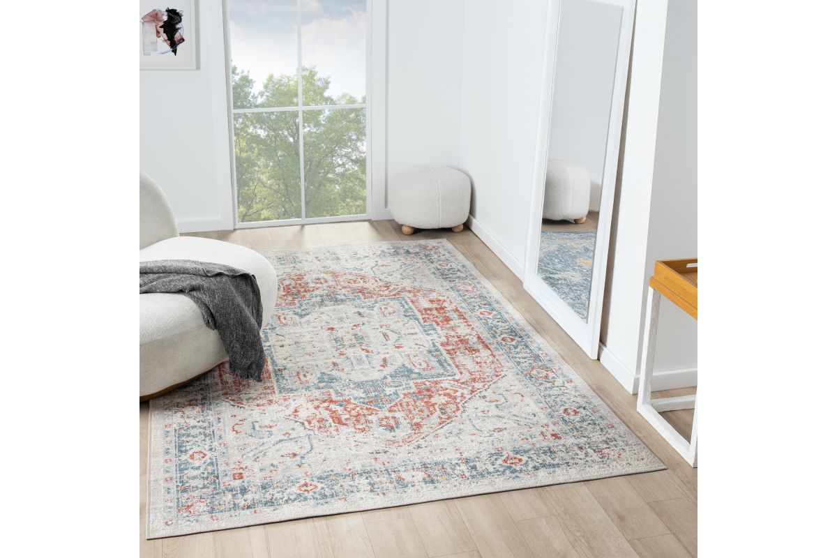 Transform your space with a perfect balance of durability and style with this versatile indoor/outdoor area rug. A bordered faded medallion with delicate distressing graces this piece from edge to edge in shades of red, gray, and blue, creating an eye-catching foundation for patios, decks, sunrooms, living rooms, bedrooms, and any area indoors or out. Each rug is power loomed using traditional techniques out of polypropylene fibers, which allow you to enjoy high-end design without sacrificing comfort or durability. Perfect for a wide range of decor styles and ages from adult to kids, this beautiful rug will do well in any area of your home. The performance materials and construction make this rug fade, stain, and moisture resistant - perfect for busy homes with children and pet friendly.