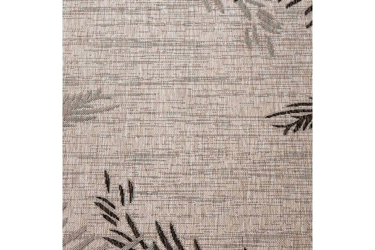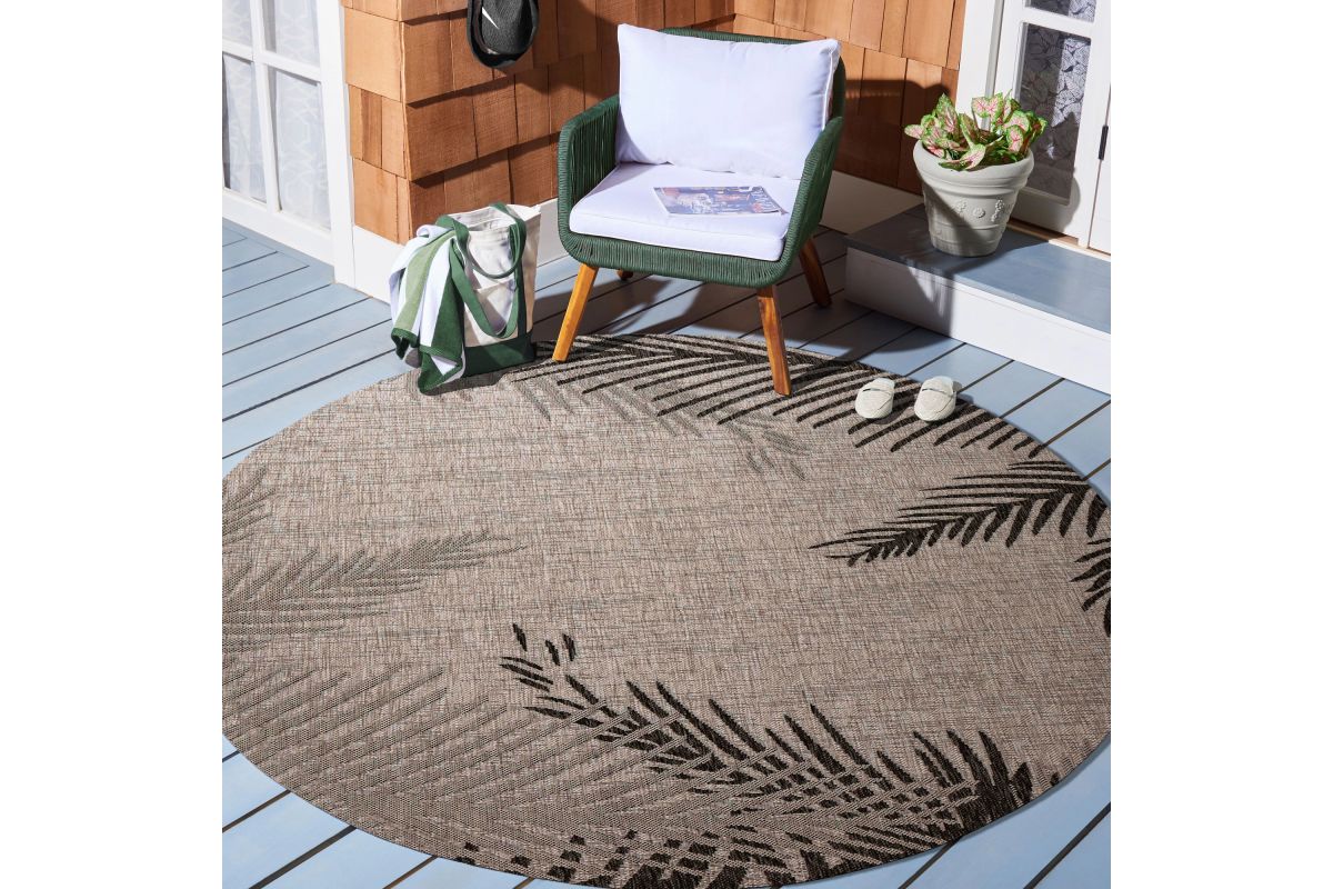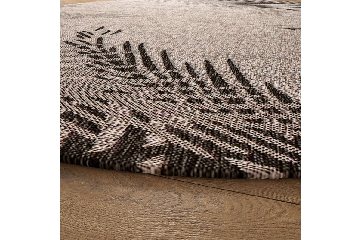 Transform any space with this versatile coastal flatweave area rug, perfect for indoor and outdoor use. Featuring a stylish black palm frond design on a beige background, it creates a striking foundation for your deck, patio, lanai, living room, or dining room. Power loomed from durable polypropylene fibers, this rug is lightweight, comfortable underfoot, and built to last. Its fade, stain, and moisture resistant construction ensures long-lasting beauty, whether placed indoors or outdoors. Measuring 5'3" round, it’s the perfect size to define smaller outdoor seating areas, highlight a patio bistro set, or create a focal point on a porch or balcony. Complement a wide range of décor styles from tropical to contemporary with this easy-to-maintain, high-quality rug.