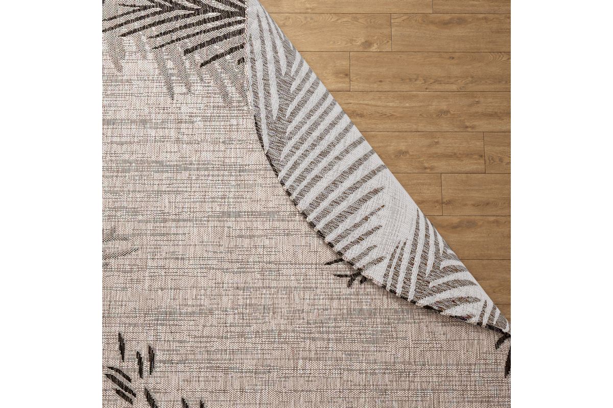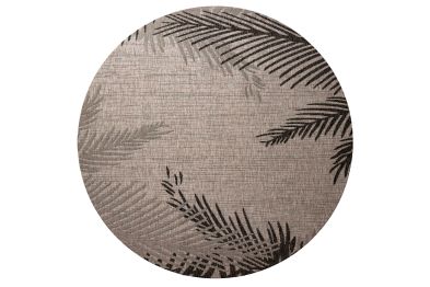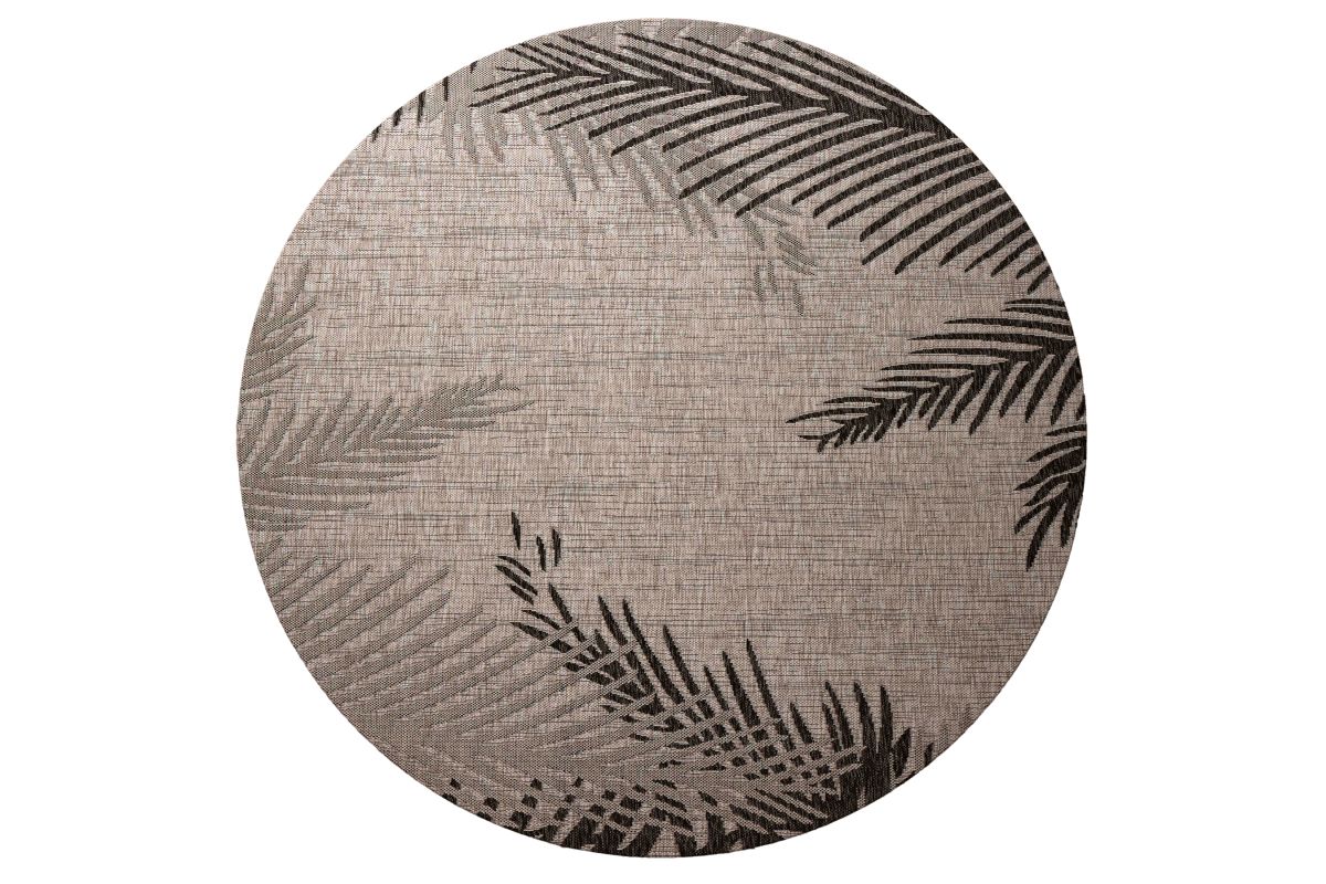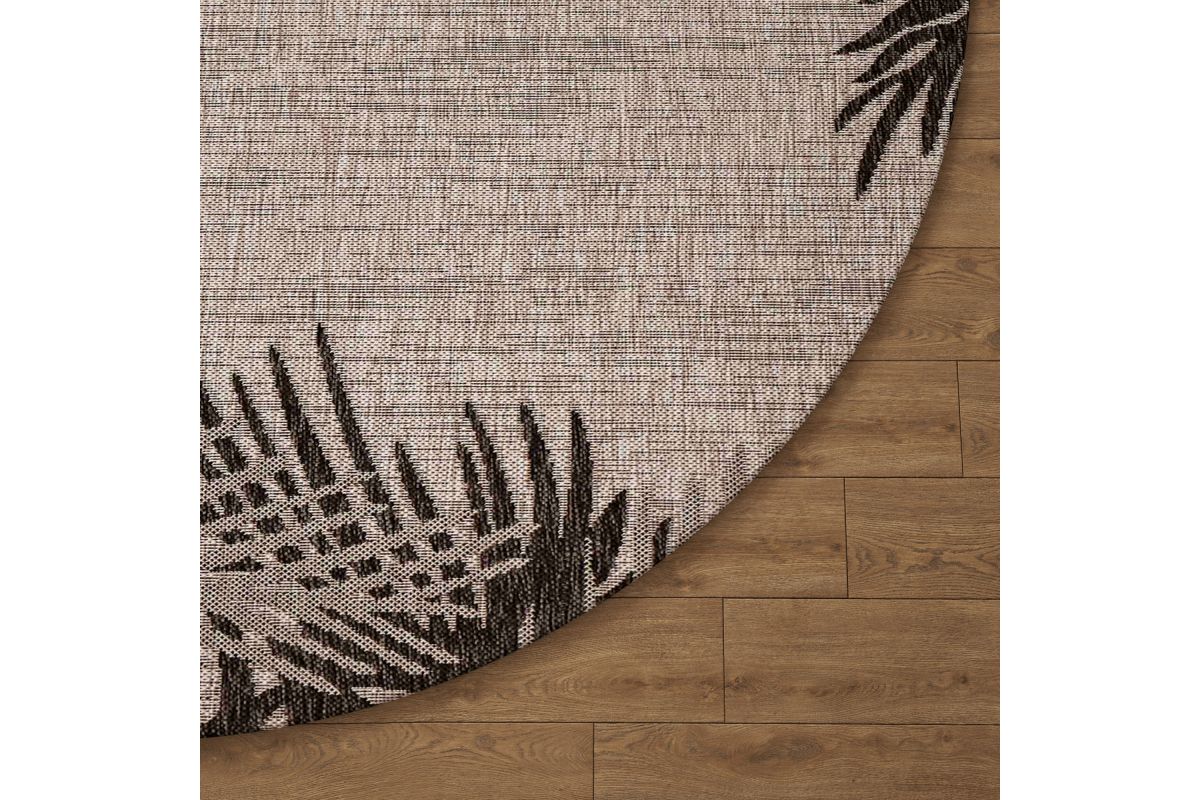 Transform any space with this versatile coastal flatweave area rug, perfect for indoor and outdoor use. Featuring a stylish black palm frond design on a beige background, it creates a striking foundation for your deck, patio, lanai, living room, or dining room. Power loomed from durable polypropylene fibers, this rug is lightweight, comfortable underfoot, and built to last. Its fade, stain, and moisture resistant construction ensures long-lasting beauty, whether placed indoors or outdoors. Measuring 7'6" round, it’s generously sized to anchor larger outdoor seating areas, define a dining set, or create a stylish centerpiece on your patio or deck. Complement a wide range of décor styles from tropical to contemporary with this easy-to-maintain, high-quality rug.