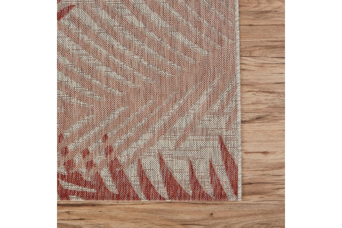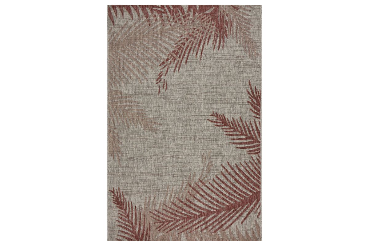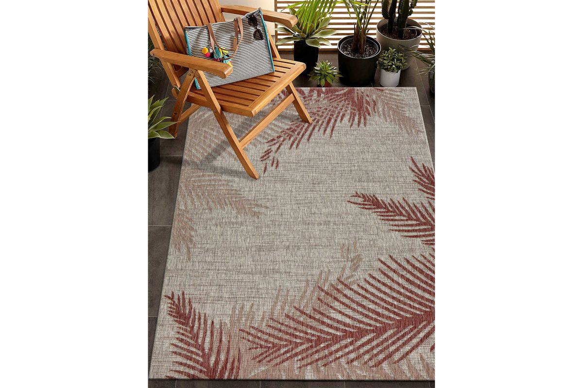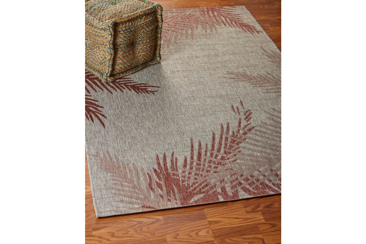 Transform any space with this versatile coastal flatweave area rug, perfect for indoor and outdoor use. Featuring a stylish red palm frond design on a beige background, it creates a striking foundation for your deck, patio, lanai, living room, or dining room. Power loomed from durable polypropylene fibers, this rug is lightweight, comfortable underfoot, and built to last. Its fade, stain, and moisture resistant construction ensures long-lasting beauty, whether placed indoors or outdoors. Measuring 7'9" x 9'5", it’s a spacious choice for larger patios, decks, or outdoor dining areas, creating a defined and comfortable foundation for entertaining. Complement a wide range of décor styles from tropical to contemporary with this easy-to-maintain, high-quality rug.