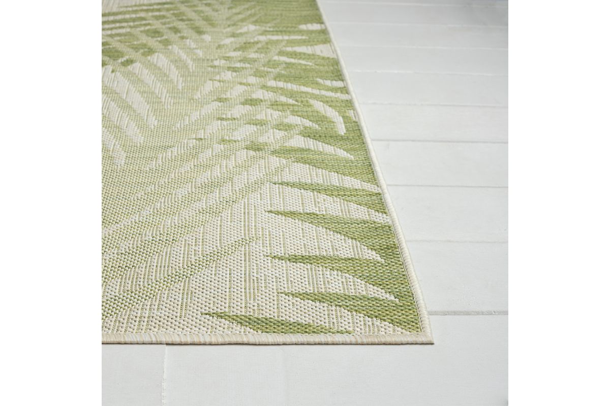 Transform any space with this versatile coastal flatweave area rug, perfect for indoor and outdoor use. Featuring a stylish green palm frond design on a beige background, it creates a striking foundation for your deck, patio, lanai, entryway, or hallway. Power loomed from durable polypropylene fibers, this rug is lightweight, comfortable underfoot, and built to last. Its fade, stain, and moisture resistant construction ensures long-lasting beauty, whether placed indoors or outdoors. Measuring 1'10" x 3'0", it’s ideal for small spaces such as bathrooms, apartments, dorms, and entryways. Complement a wide range of décor styles from tropical to contemporary with this easy-to-maintain, high-quality rug.