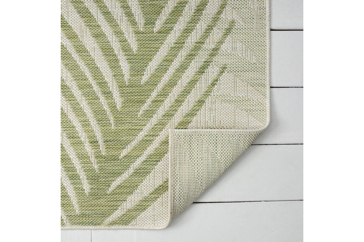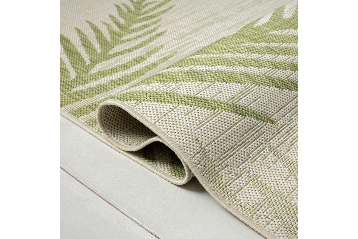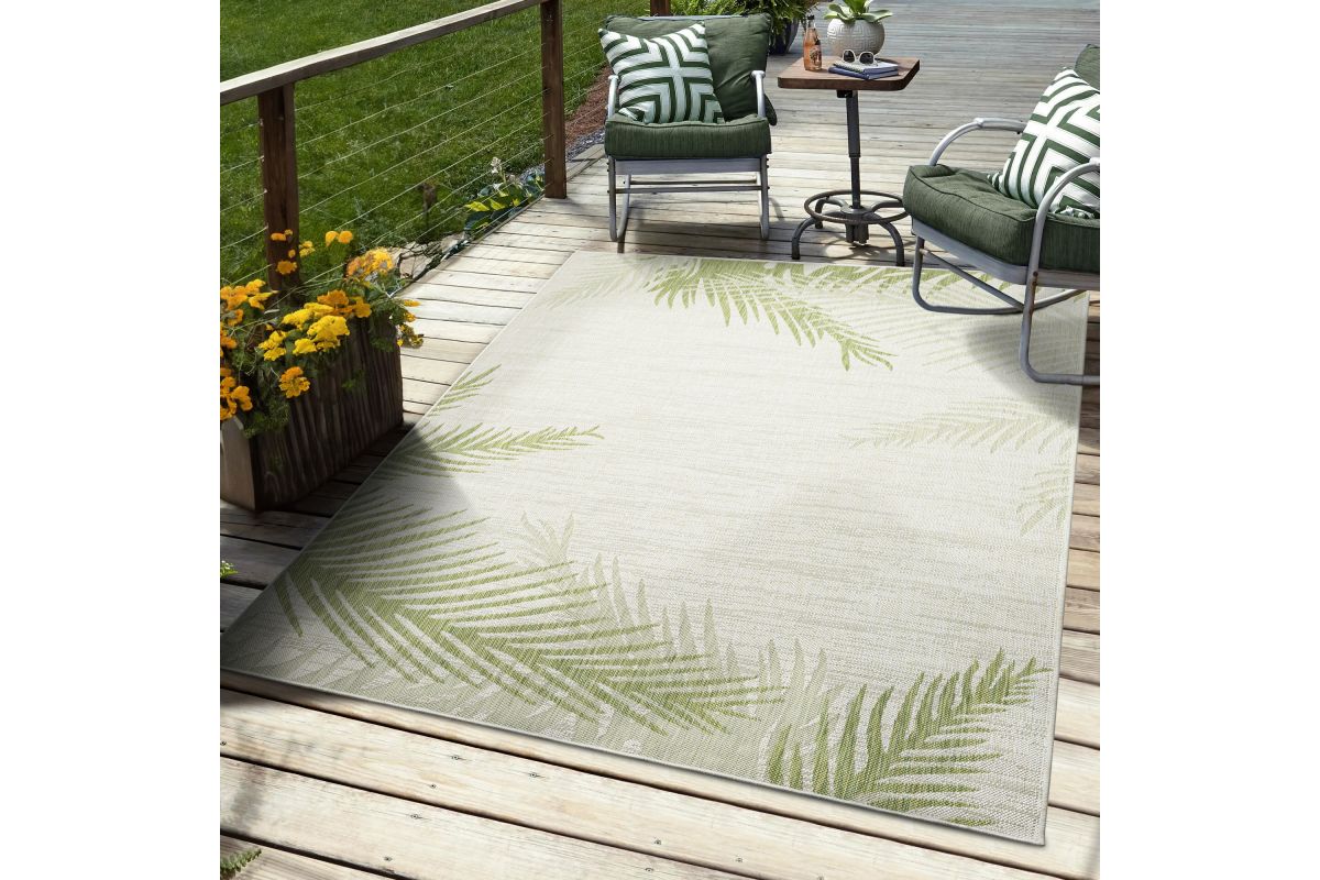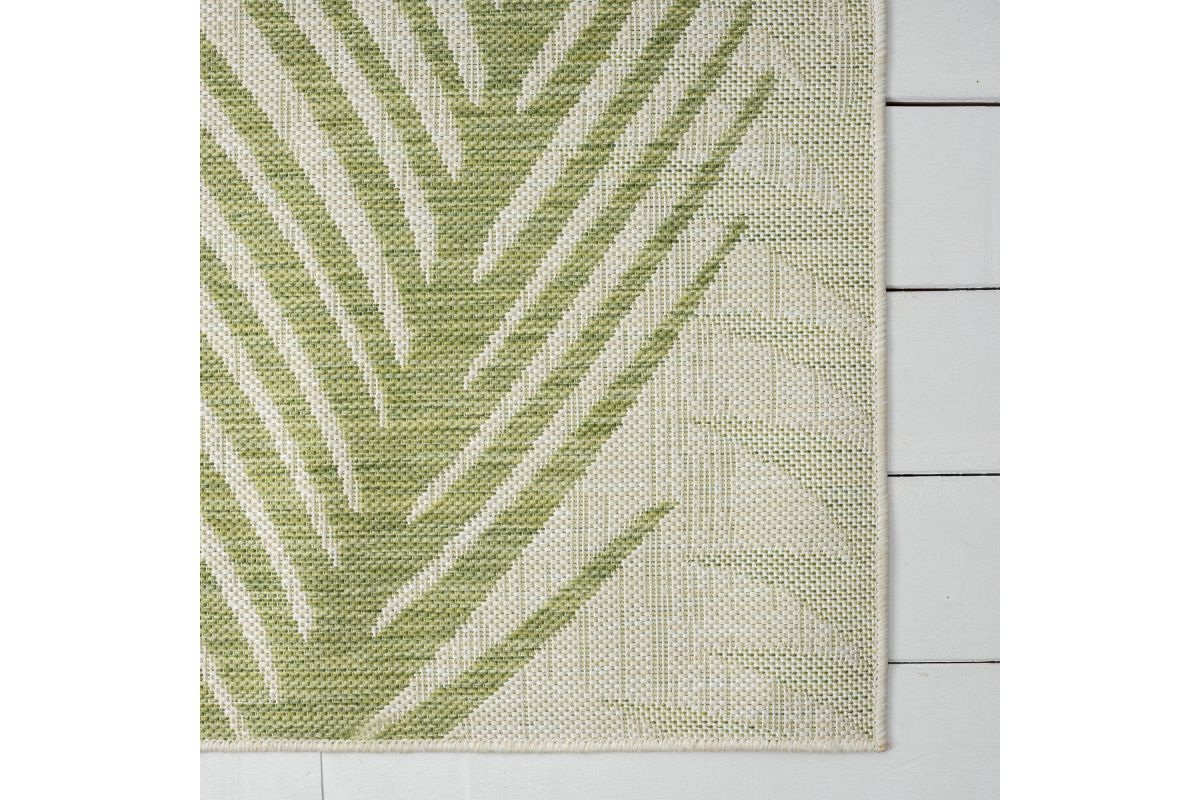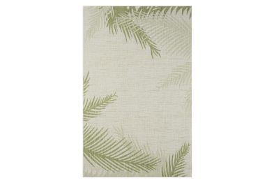 Transform any space with this versatile coastal flatweave area rug, perfect for indoor and outdoor use. Featuring a stylish green palm frond design on a beige background, it creates a striking foundation for your deck, patio, lanai, living room, or bedroom. Power loomed from durable polypropylene fibers, this rug is lightweight, comfortable underfoot, and built to last. Its fade, stain, and moisture resistant construction ensures long-lasting beauty, whether placed indoors or outdoors. Measuring 5' x 7', it’s an ideal size for patios, decks, or porches, offering a stylish foundation for your outdoor seating or dining area. Complement a wide range of décor styles from tropical to contemporary with this easy-to-maintain, high-quality rug.