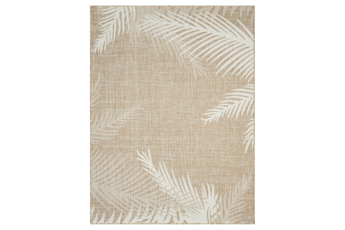 Transform any space with this versatile coastal flatweave area rug, perfect for indoor and outdoor use. Featuring a stylish ivory palm frond design on a beige background, it creates a striking foundation for your deck, patio, lanai, living room, or bedroom. Power loomed from durable polypropylene fibers, this rug is lightweight, comfortable underfoot, and built to last. Its fade, stain, and moisture resistant construction ensures long-lasting beauty, whether placed indoors or outdoors. Measuring 5' x 7', it’s an ideal size for patios, decks, or porches, offering a stylish foundation for your outdoor seating or dining area. Complement a wide range of décor styles from tropical to contemporary with this easy-to-maintain, high-quality rug.