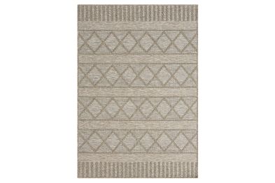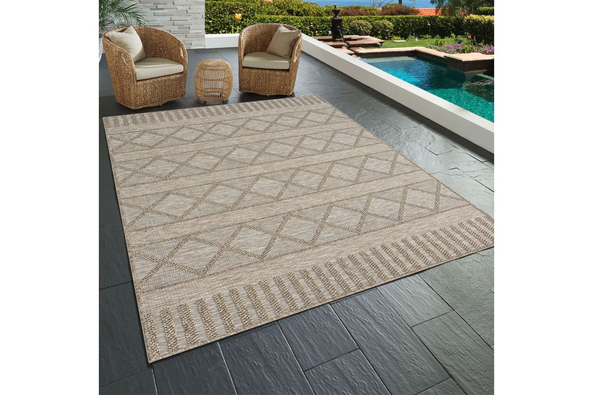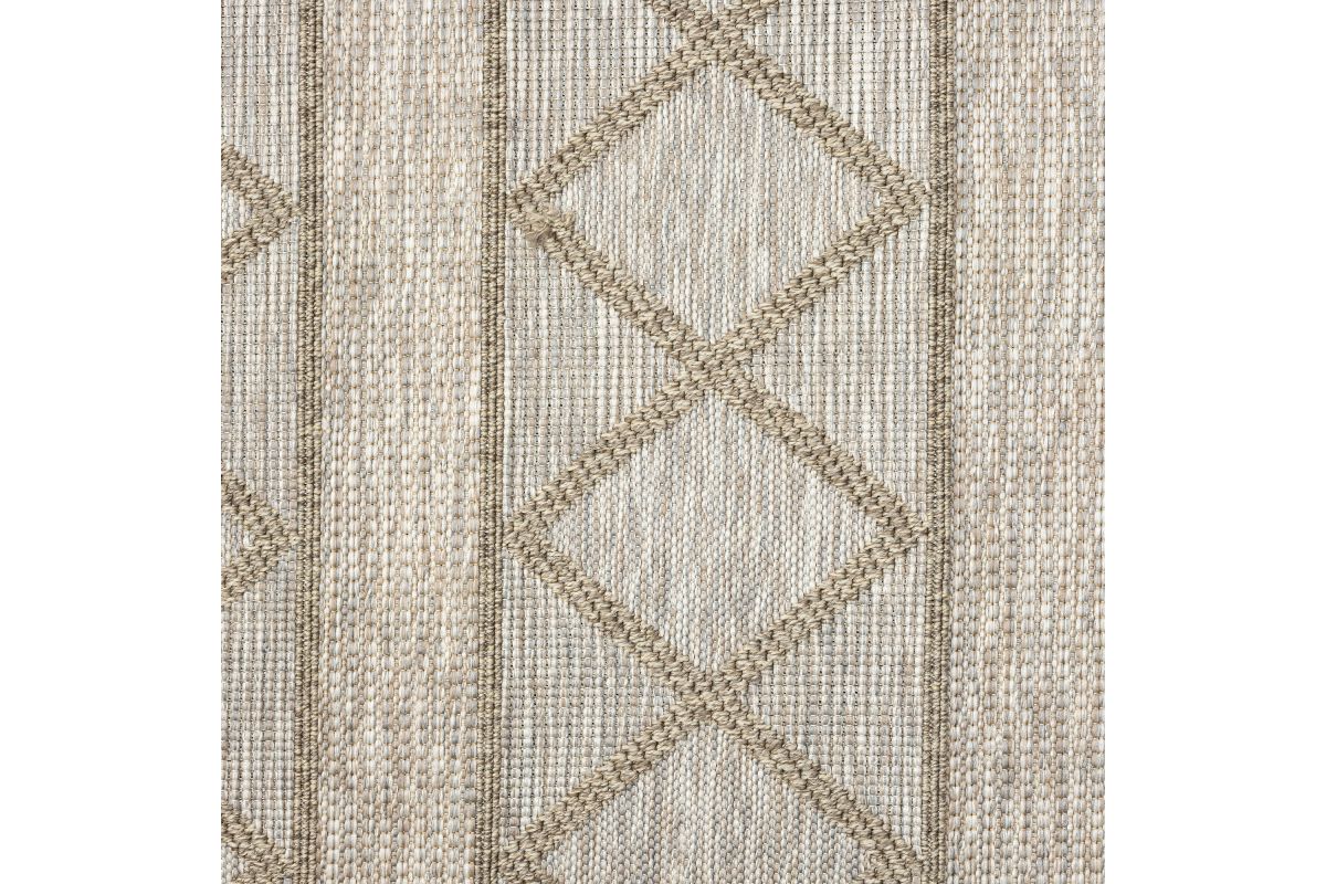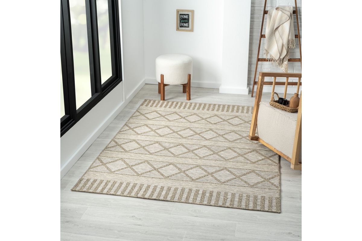 Accent your home with this modern geometric diamond indoor and outdoor safe area rug. Inspired from the natural tones and designs of jute pieces, this rug features a variety of patterns and textures to bring a stunning natural look to your outdoor space. Powerloomed in Egypt from stain and fade resistant polypropylene threads, this rug is the perfect piece for everyday use. Perfectly suited for living rooms, dining rooms, kitchens, bedrooms, and patios, add aesthetic functionality with this neutral long-lasting, and durable indoor and outdoor safe rug.