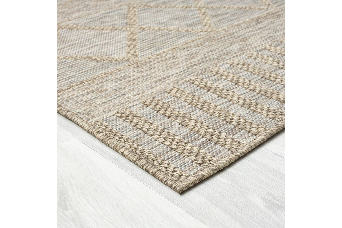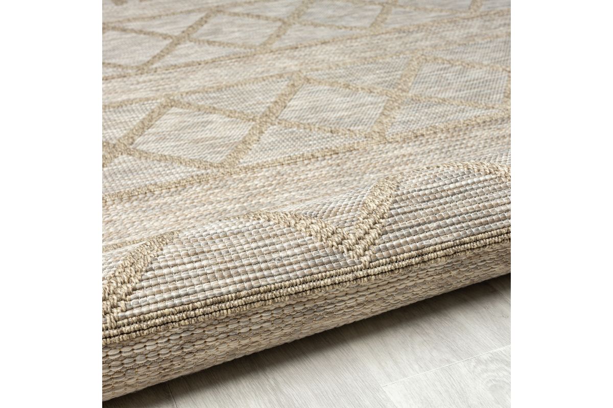 Accent your home with this modern geometric diamond indoor and outdoor safe area rug. Inspired from the natural tones and designs of jute pieces, this rug features a variety of patterns and textures to bring a stunning natural look to your outdoor space. Powerloomed in Egypt from stain and fade resistant polypropylene threads, this rug is the perfect piece for everyday use. Perfectly suited for living rooms, dining rooms, kitchens, bedrooms, and patios, add aesthetic functionality with this neutral long-lasting, and durable indoor and outdoor safe rug.
