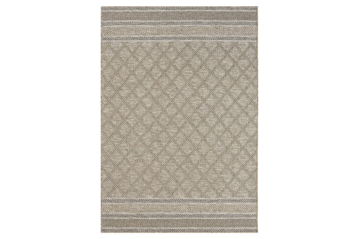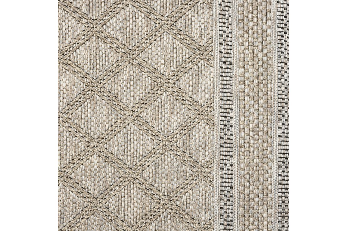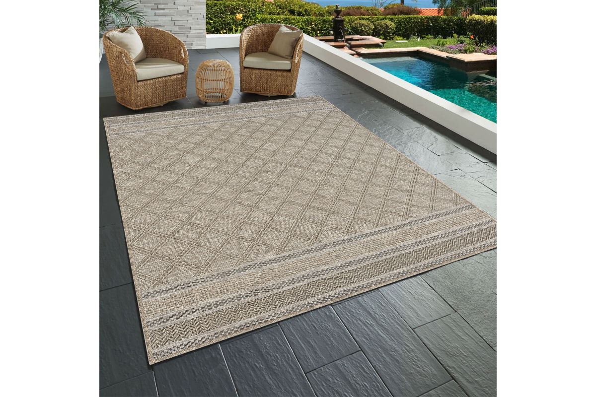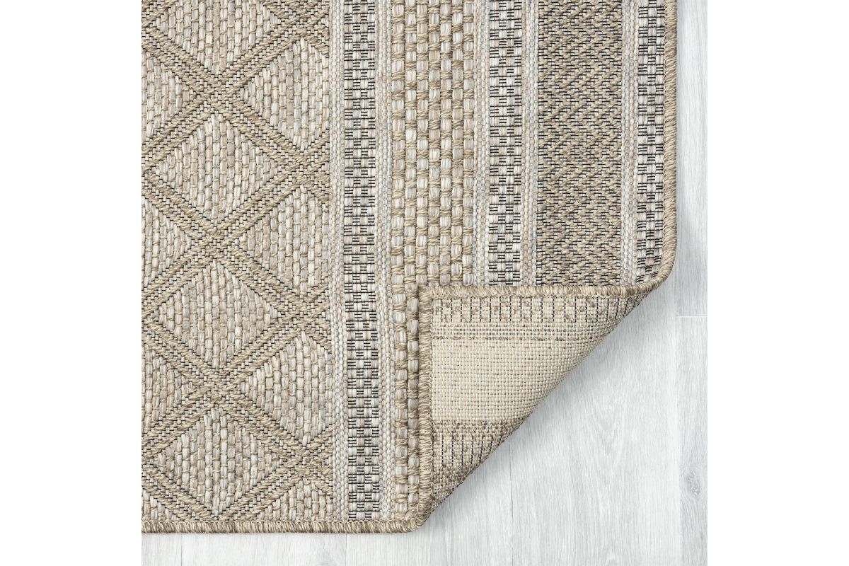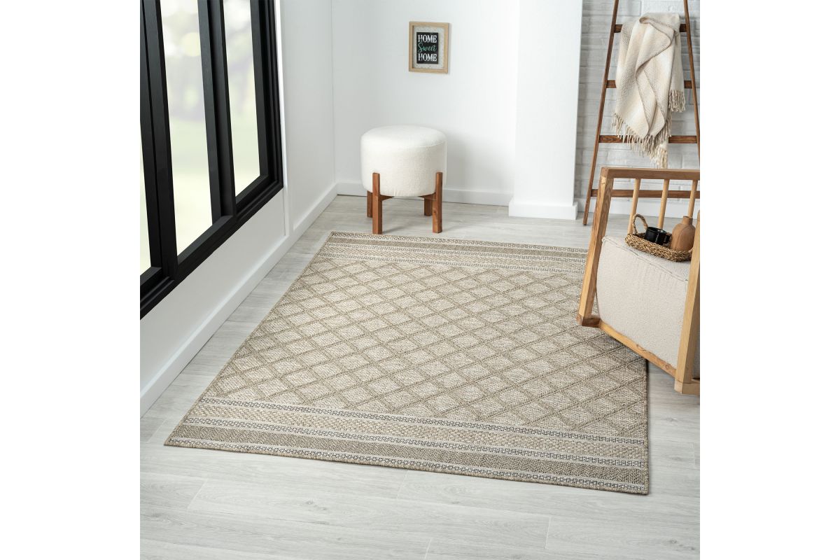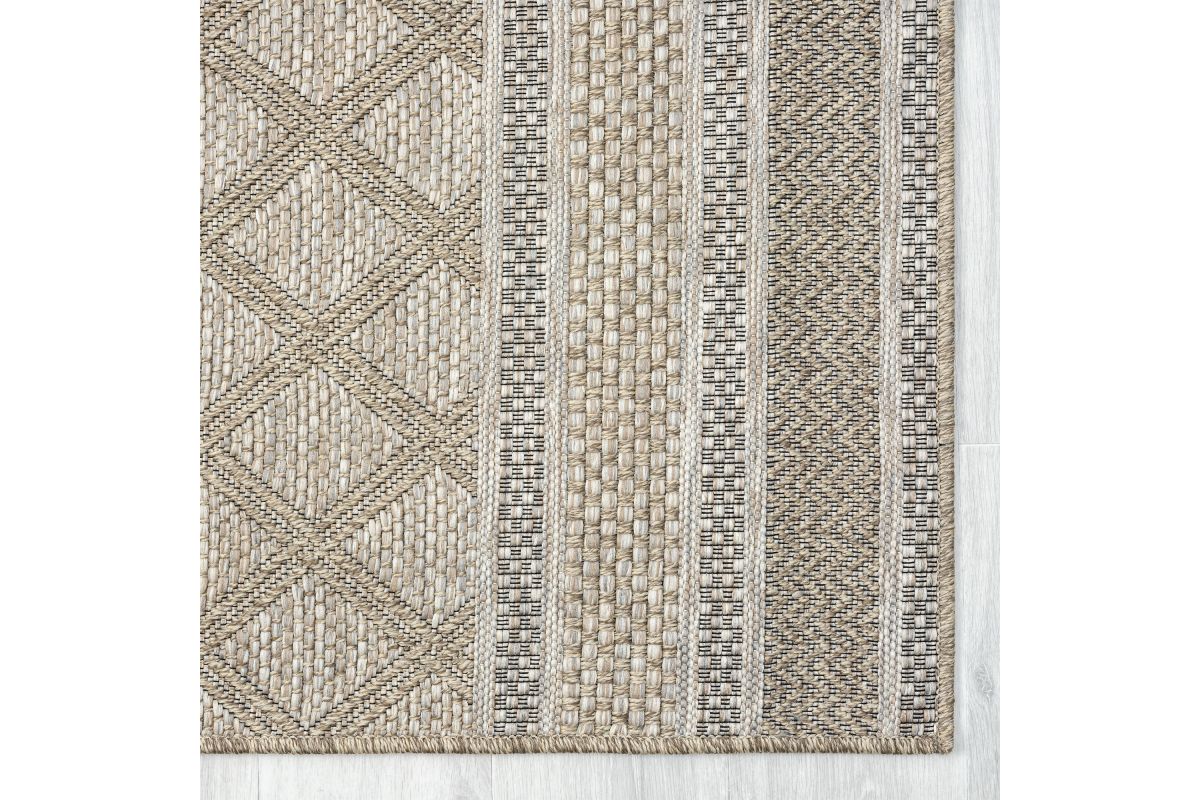 Accent your home with this modern geometric indoor and outdoor safe area rug. Inspired from the natural tones and designs of jute pieces, this rug features a variety of patterns and textures to bring a stunning natural look to your outdoor space. Powerloomed in Egypt from stain and fade resistant polypropylene threads, this rug is the perfect piece for everyday use. Perfectly suited for living rooms, dining rooms, kitchens, bedrooms, and patios, add aesthetic functionality with this neutral long-lasting, and durable indoor and outdoor safe rug.