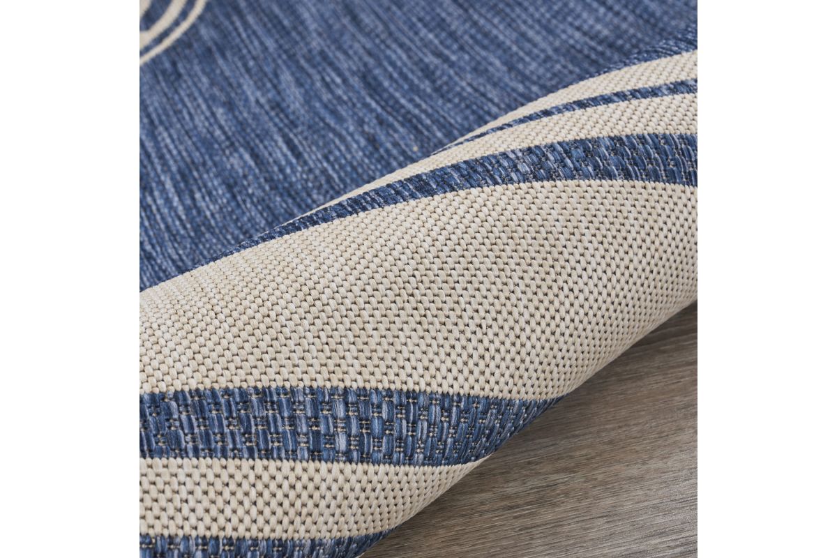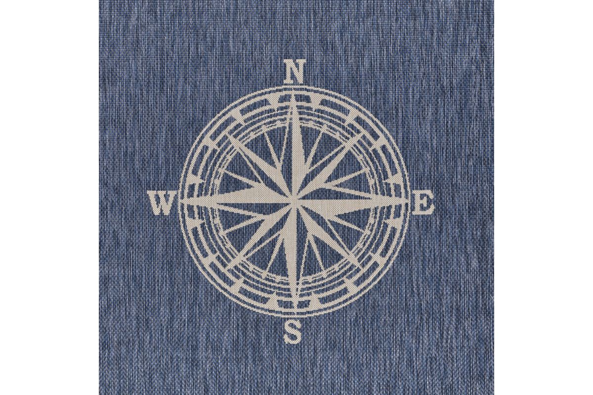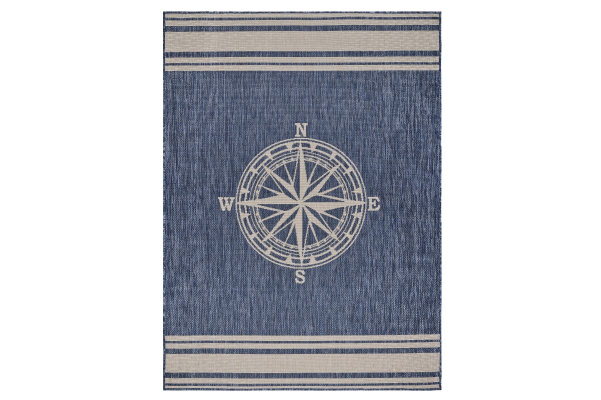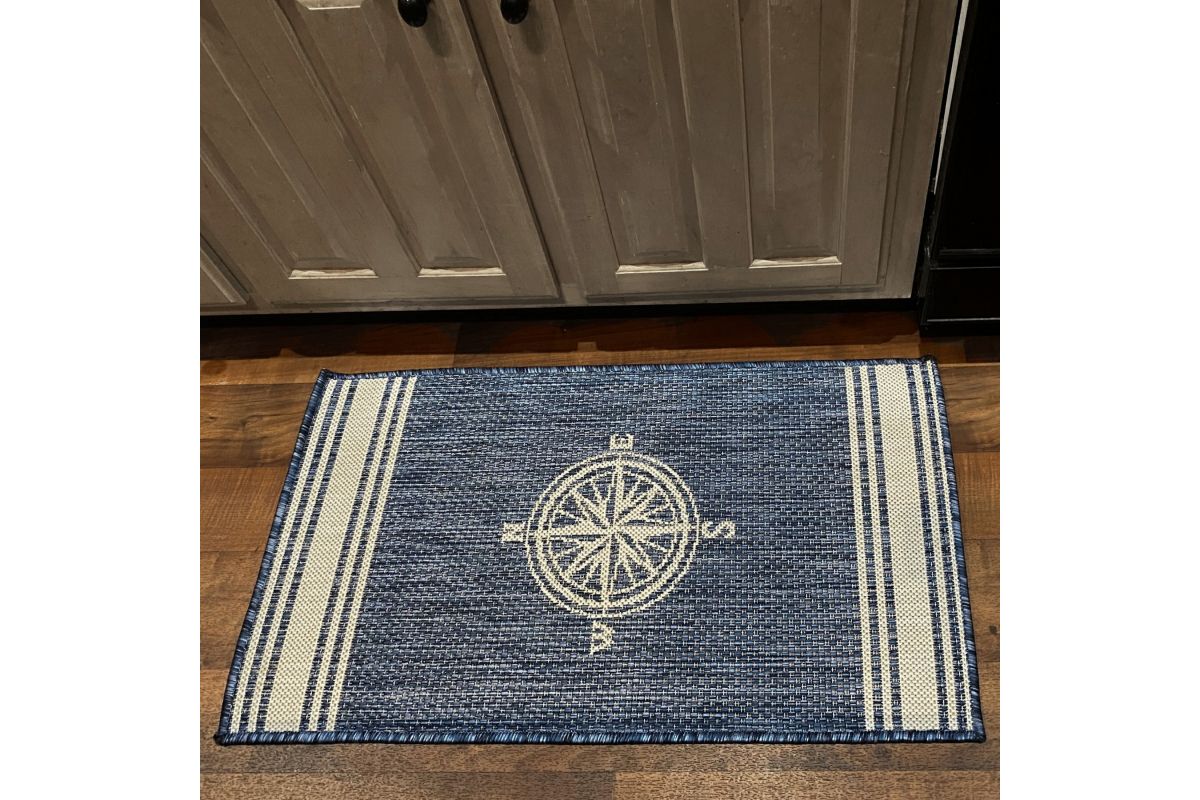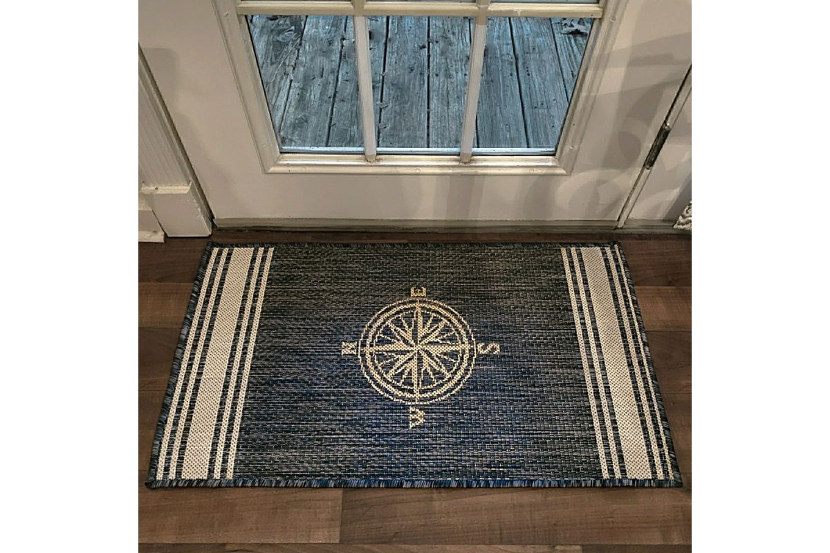 Transform your space with this durable indoor/outdoor area rug. The nautical-inspired compass pattern in navy blue and white adds coastal charm, making it a stunning foundation for beach house, tropical, or nautical interiors or exteriors. Expertly power-loomed in Turkey, this rug is crafted from a premium polypropylene blend, offering a soft yet durable texture that stands up to everyday wear and outdoor elements. Perfect for adding a colorful touch to entryways, kitchen sinks, or other compact spaces, this 1'10" x 3' rug blends coastal charm with lasting quality. Designed for high-traffic areas, this stain, moisture, and fade-resistant, easy-to-clean rug maintains long-lasting beauty, ensuring your home stays stylish with minimal maintenance. Perfect for anyone seeking a durable, elegant, and versatile rug for your home, apartment, or dorm.
