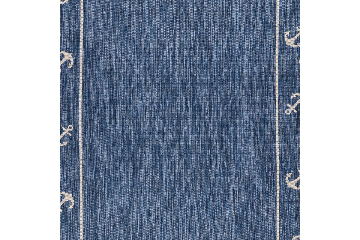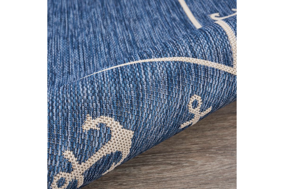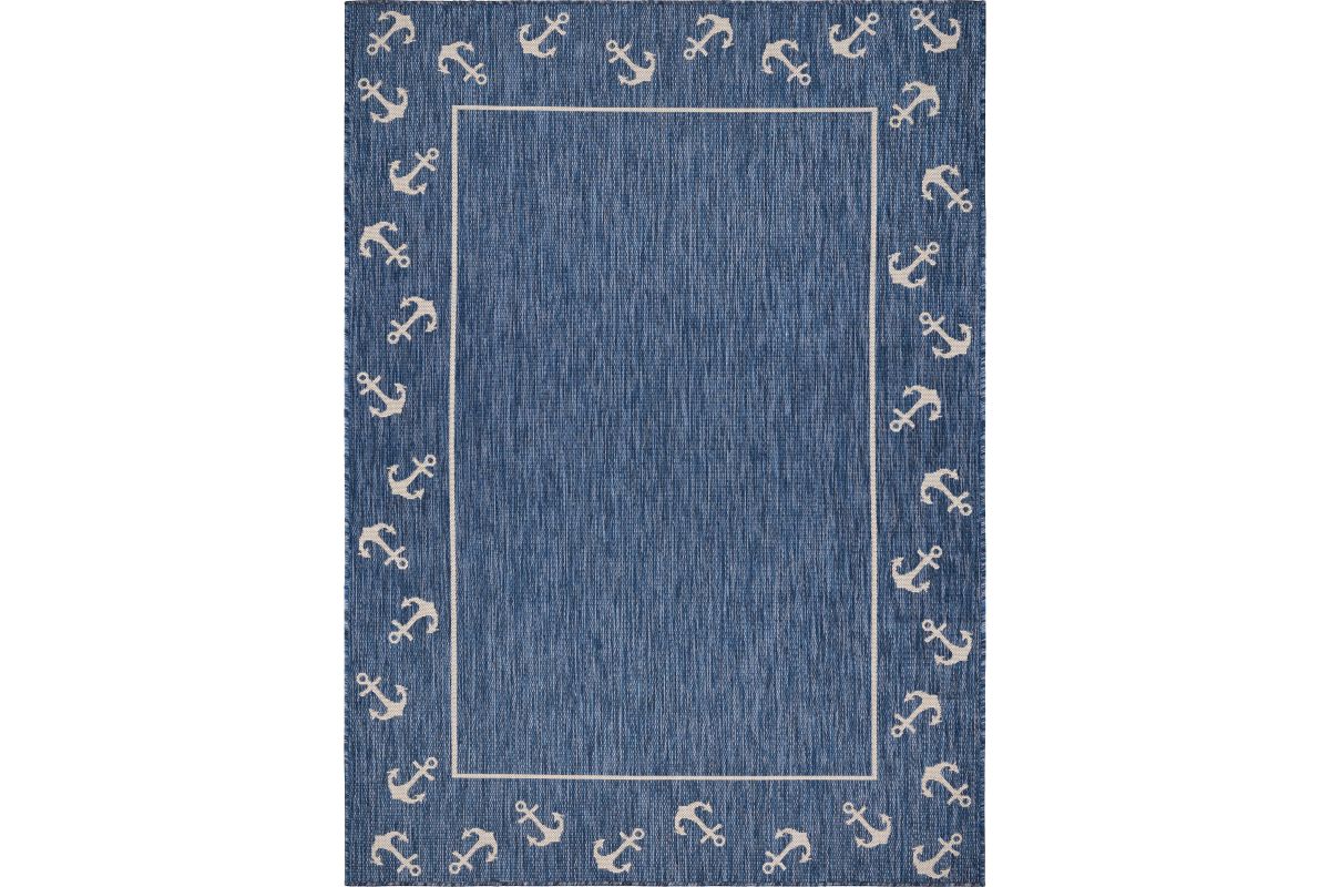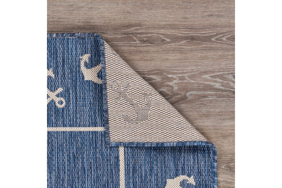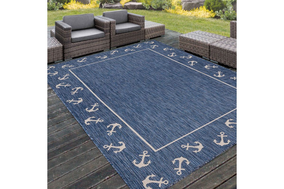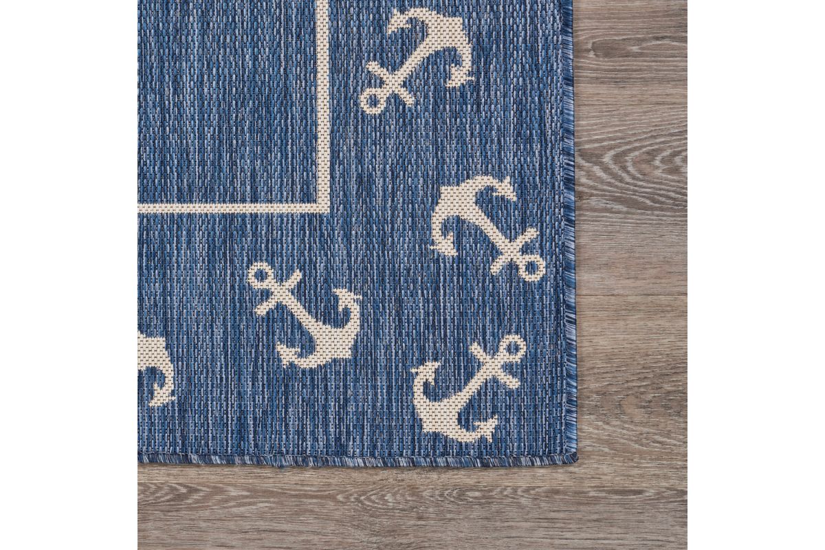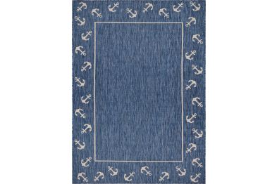 Transform your space with this durable indoor/outdoor area rug. The nautical-inspired bordered anchor pattern in navy blue and white adds coastal charm, making it a stunning foundation for beach house, tropical, or nautical interiors or exteriors. Expertly power-loomed in Turkey, this rug is crafted from a premium polypropylene blend, offering a soft yet durable texture that stands up to everyday wear and outdoor elements. Perfect for adding a refined touch to living rooms, bedrooms, or home offices, this 5'3" x 7' rug blends coastal charm with lasting quality. Designed for high-traffic areas, this stain, moisture, and fade-resistant, easy-to-clean rug maintains long-lasting beauty, ensuring your home stays stylish with minimal maintenance. Perfect for anyone seeking a durable, elegant, and versatile rug for your home, apartment, or dorm.